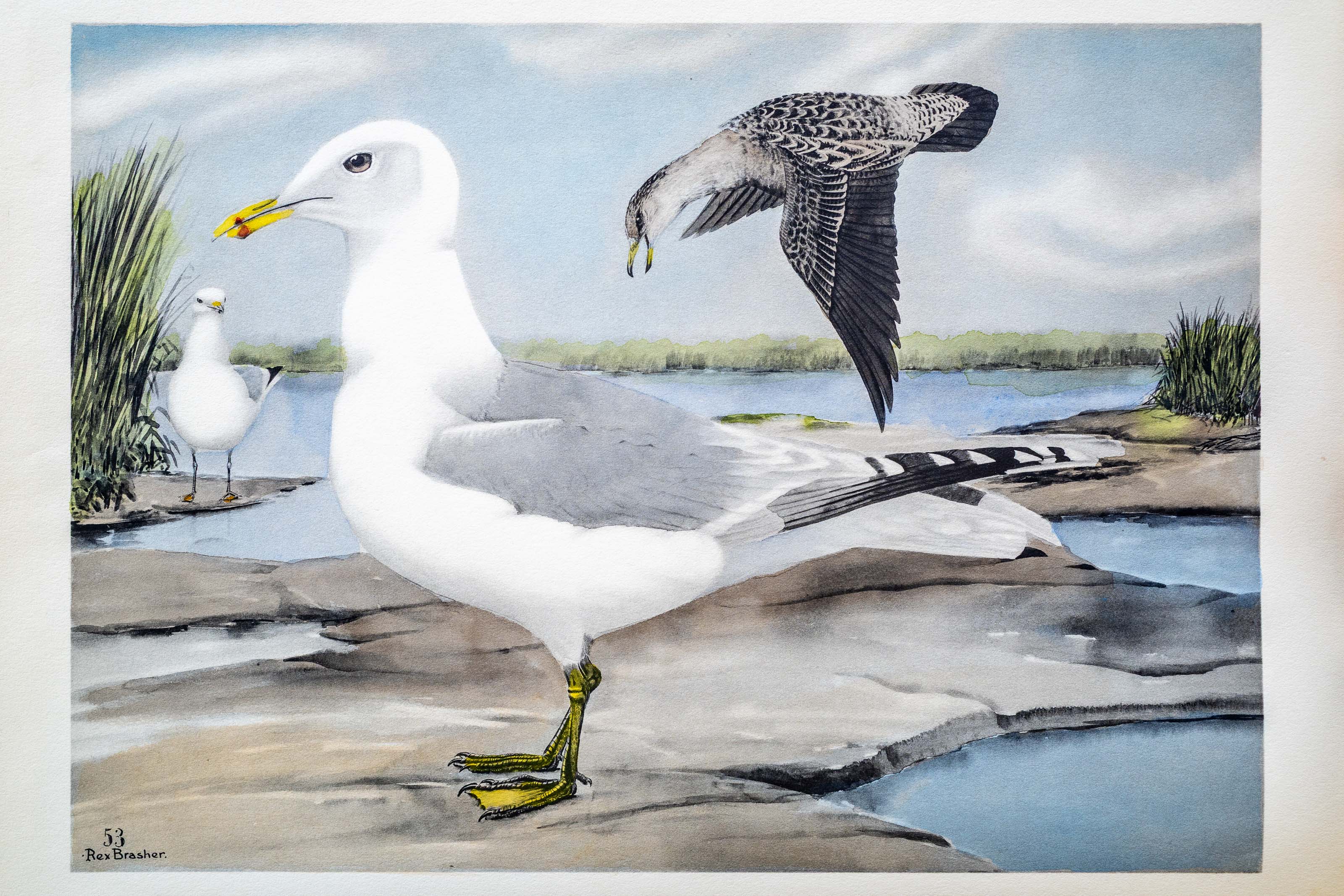 Except in Winter these Gulls are seldom seen on the seashore. They spend three-quarters of the year on inland western lakes and follow a plow with keen eyes, allowing few grubs, insects or mice to escape. From Utah and the Dakotas they range thru the barren ground to the Arctic coast, congregating in thousands on some lake favorable for family cares. One observer states that a bird remained within a few feet of his outstretched hand while the steamer drove at fifteen knots into a fifteen-mile wind. There the airmaster hung without a wing-beat, merely adjusting pinions and tail to the varying currents.