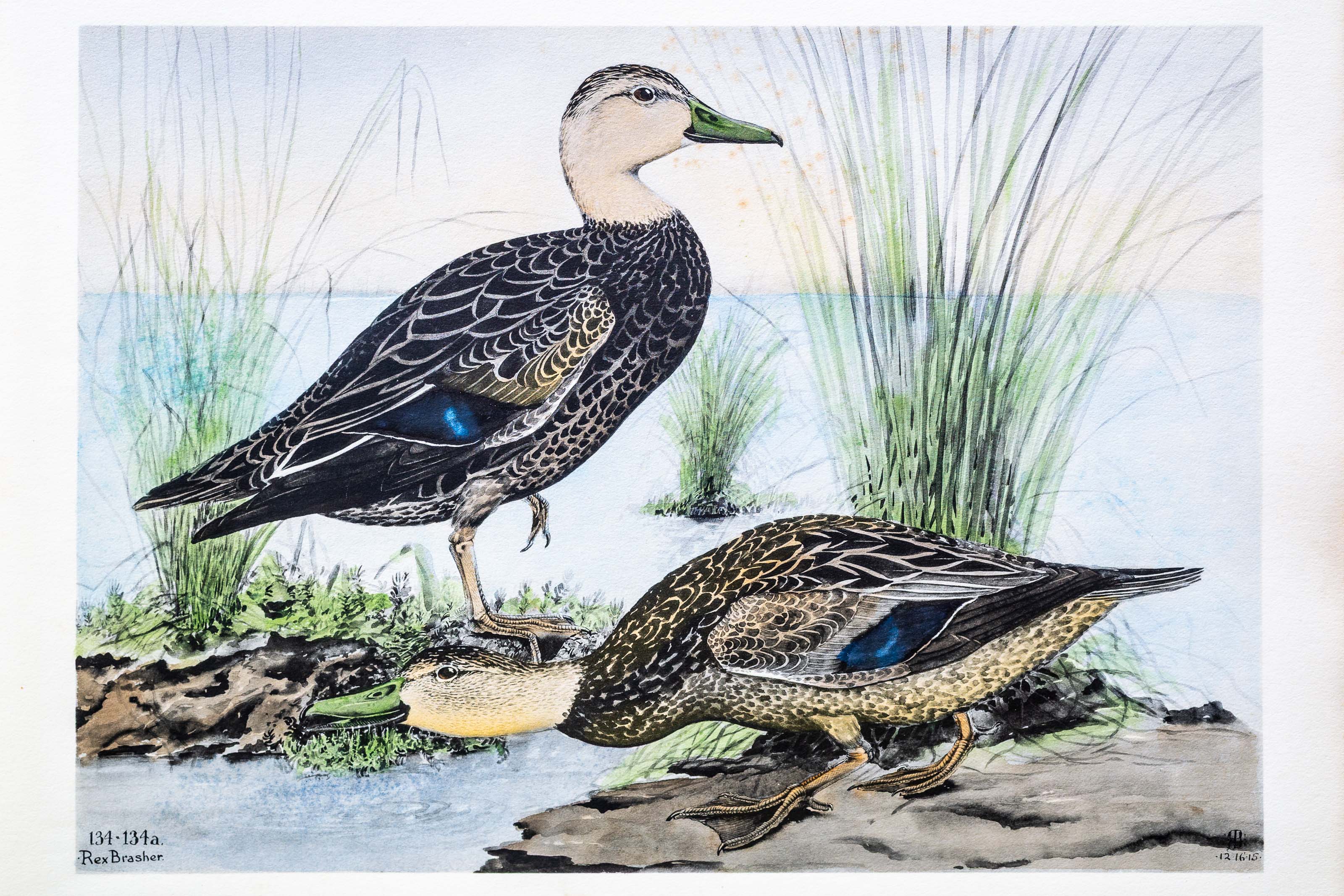 Along the Louisiana coast there exist extensive salt and brackish water marshes thru which wide creeks or bayous wind their serpentine way to the open sea. This is a haven for the myriads of Ducks and Geese which repair here to spend the winter. Upon the approach of Spring, however, they depart for their northern breeding grounds and the deserted marshes are left to the mosquitoes, the snakes and the alligators. And yet a few scattered birds tarry and brave the discomforts of the sweltering summer days. At this season if you quietly paddled a pirogue along the smaller bayous, there would be a chance of coming upon the rare, elusive FLORIDA DUCK and her brood and you might get a glimpse or even a quick photograph of them before they hurry into the marsh and disappear — (Pearson).