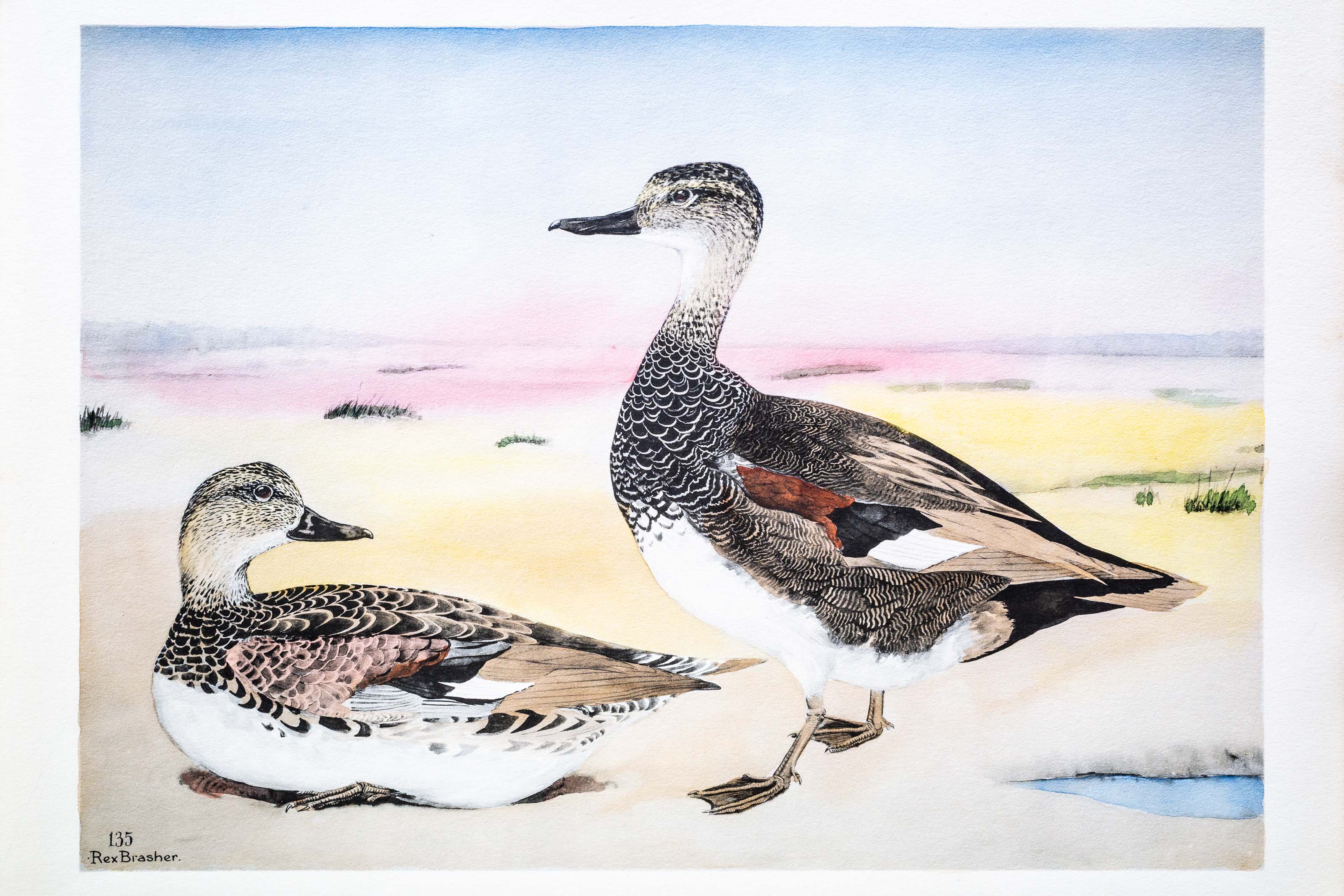 GADWALLS are clannish, seldom mingling with other ducks and usually gather in small flocks. The rufus coverts, white speculum and swift whistling flight makes their identification easy. They are extremely rare in the east where I have seen them only four times in half a century. Altho resting high and light on the surface they are expert divers.