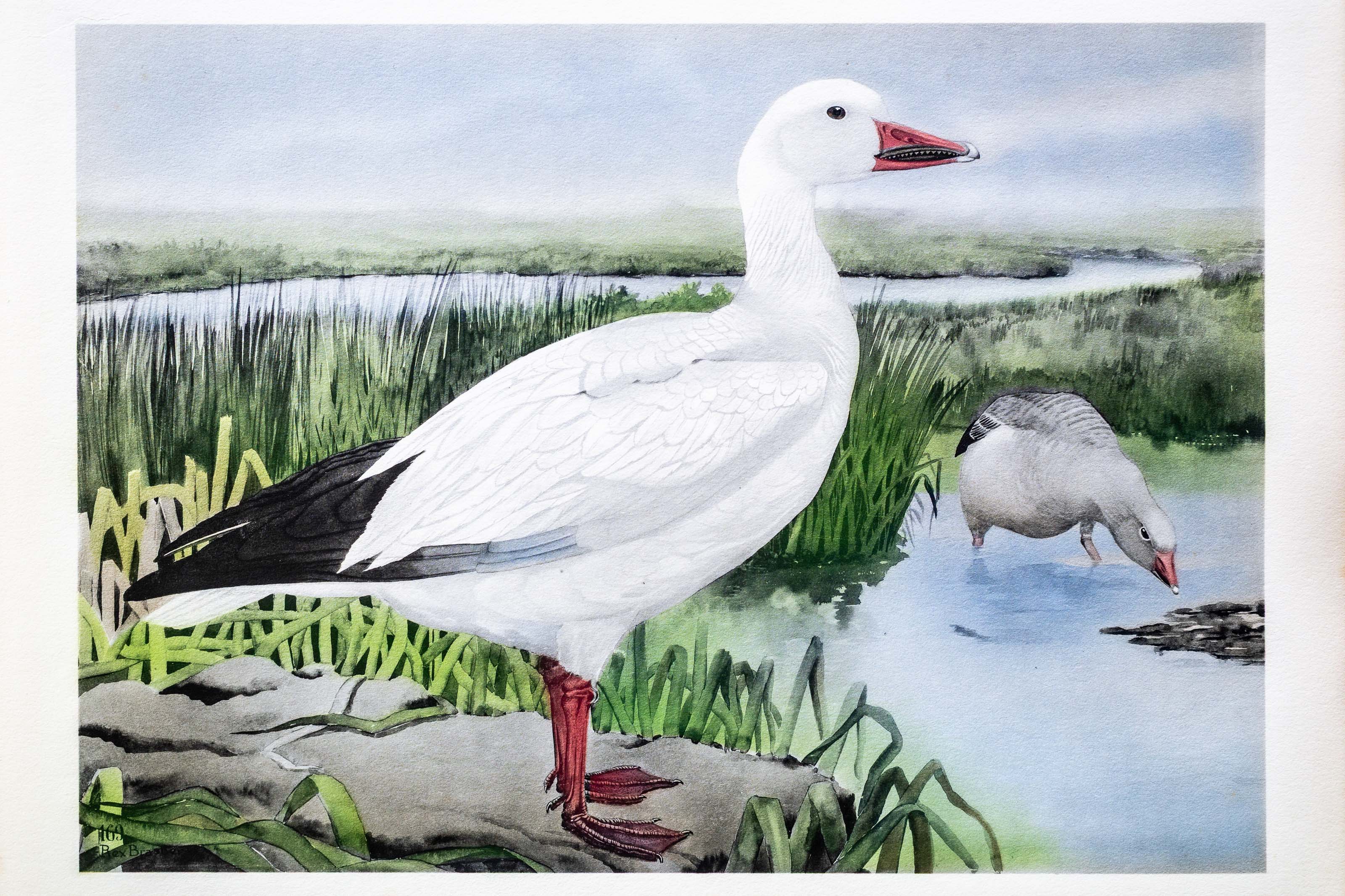 The tide was low and the birds scarcely within range so I dropped like Deadwood Dick on an Indian's trail and ran behind the sand ramparts until opposite the unsuspecting quartet. I slid the rifle between a tuft of beach grass — and the nearest bird collapsed with scarcely a wing flutter. I paced the distance — 225 feet — far enuf for a 22 pellett. The quarry was a fine mature SNOW GOOSE and its mounted form soon helped to fill my already over-crowded room, much to the dismay of my mother whose Scotch idea of cleanliness compelled her to dust the numerous specimens every week!