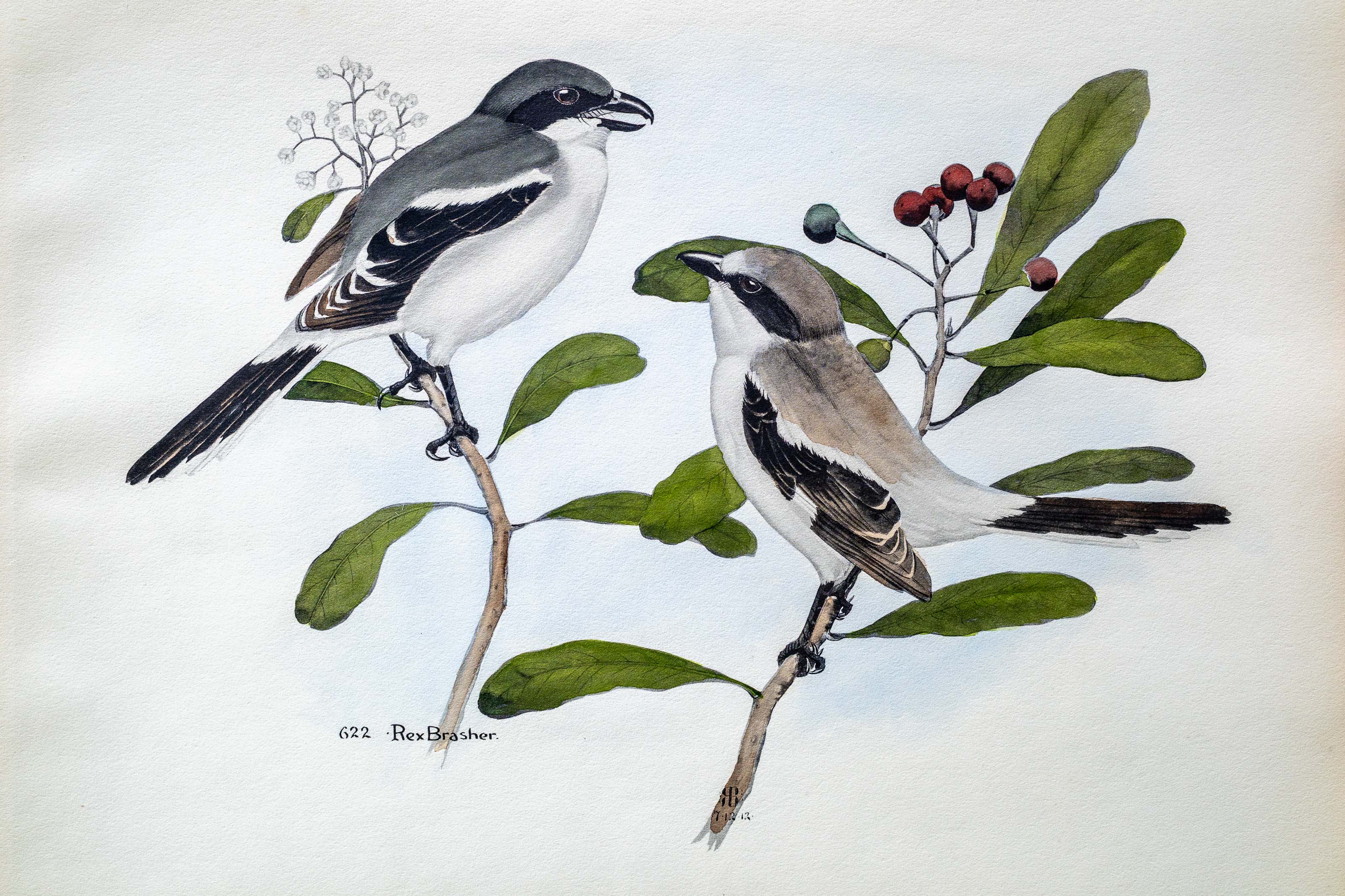 I anchored the sloop one evening opposite a small savannah on Edisto Island, South Carolina. A gray bird, which I at first thot a Mockingbird, appeared from the brush and with a long upward sweep lit on the topmast. In its wake swept a larger and darker form which struck, and both tumbled to the deck. — A Sharpshin Hawk with a LOGGERHEAD SHRIKE in his talons! A drama wherein the arch villain had acquired merit. The Shrike was dead: the Hawk escaped. In the west, beauty and peace of evening. . . . On deck, war and death.