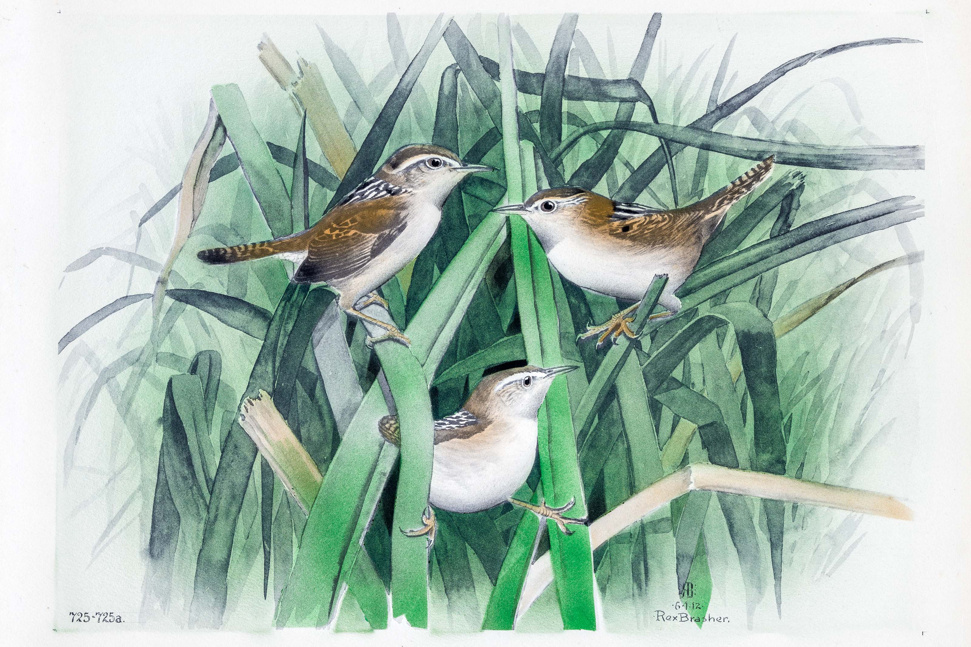 In the half mile of sinuous waterway twixt mill and railroad bridge LONG-BILLED MARSH WRENS were everywhere numerous. One day in mid-May I poled the skiff into a patch of cattails, where a dozen Marsh Wren mechanics were chattering things over, and settled down to watch building operations. All objects were magnified in the early morning mist, even the bustling bunches of brown feathers nearby seemed twice normal size as they discussed the question of continuing building while that strange animal in the boat watched them.