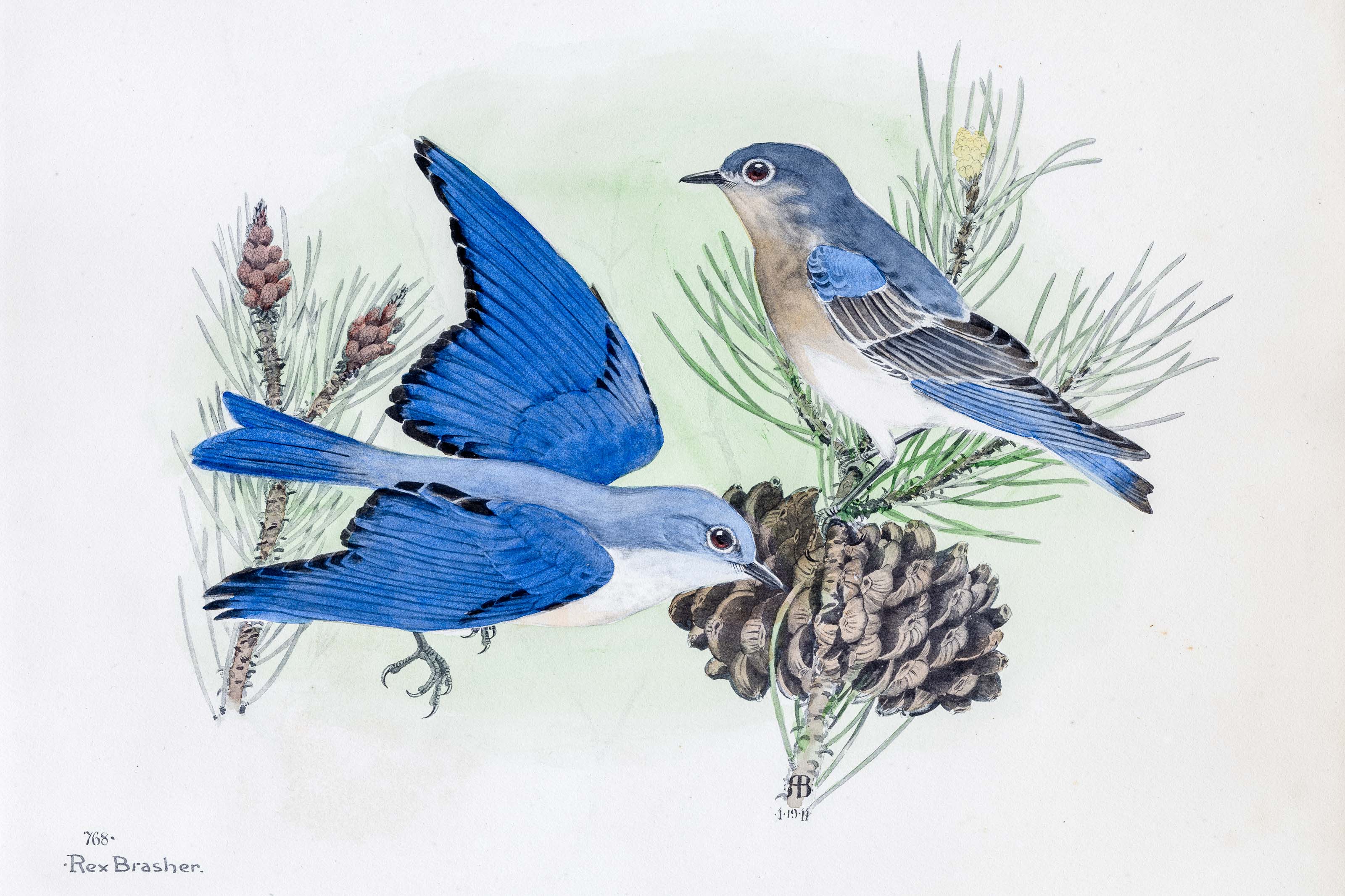 Altho most delicately colored these birds are the hardiest of the western BLUEBIRDS, frequently wandering up to timberline and sometimes above to an altitude of 13,000 feet. My friend George Gladden was greeted by a little family of them near the summit of San Antonio Peak (Old Baldy) in southern California, at an altitude of 10,000 feet, far above the clouds thru which dense billows the higher surrounding peaks loomed like islands in a motionless sea. While the unearthly quiet and indescribable weirdness of the scene deeply impressed him, it had no apparent effect upon the Bluebirds whose warblings were as sweetly plaintive on the heights as notes of their eastern brothers in a Connecticut valley orchard.