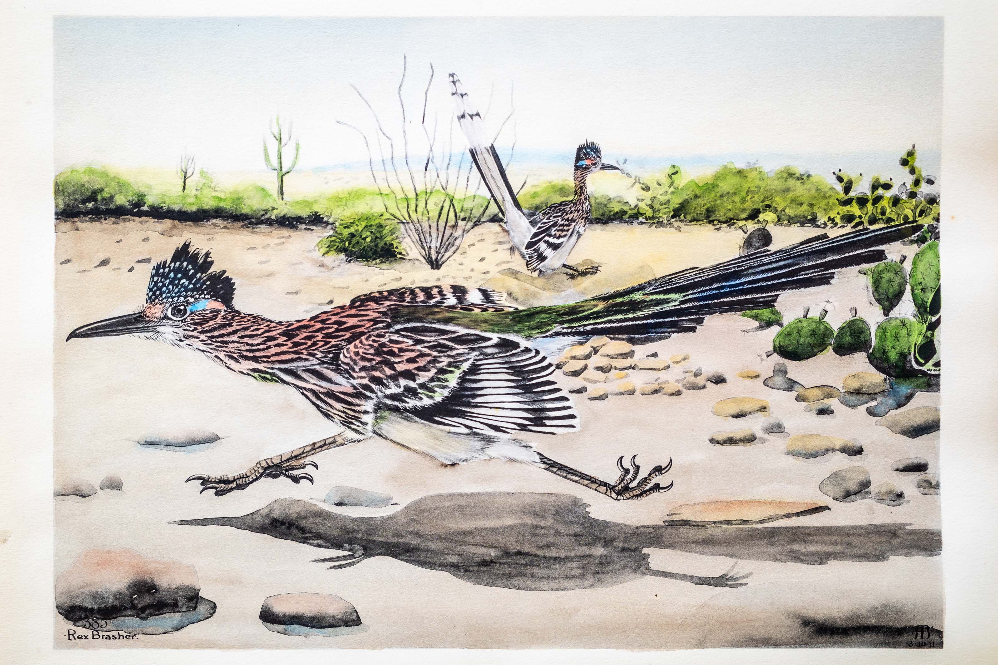 The CHAPARRAL COCK, with its ruf and coarse plumage, is the most striking and wary bird of the southwest cactus belt. Curiosity seldom overcomes shyness altho sometimes one will "freeze" upright and become part of the adjacent chollas. Travelers in the arid country they frequent will often see a dim form slipping silently along one side of the road. They are capable of sustained running speed of twenty-five miles per hour!