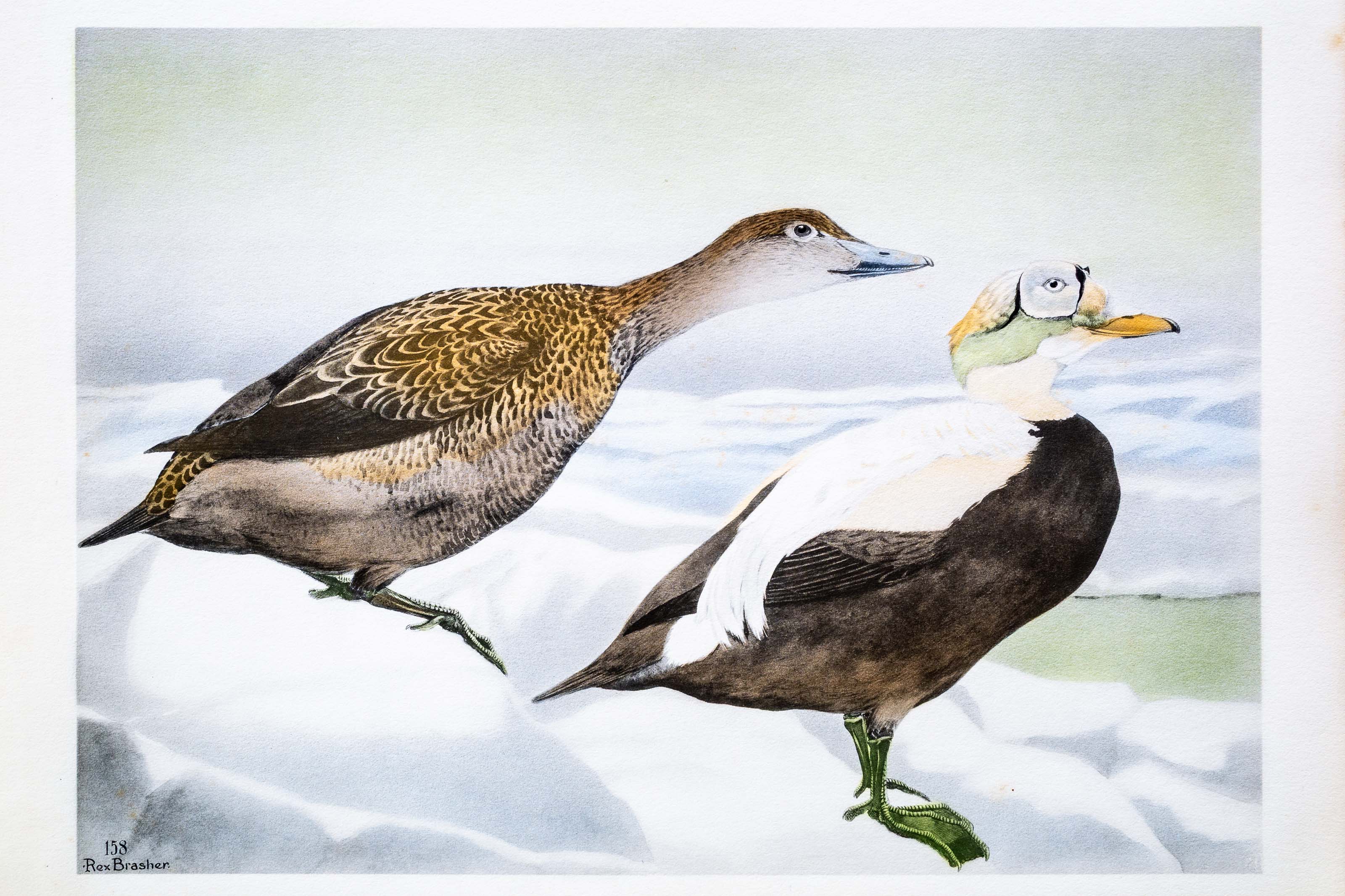 This remarkable Duck, with extraordinary facial development, is confined to a small area in Alaska. Their eclipse molt is so complete that they are unable to fly and fall victims to Eskimos who kill them in numbers, using the bodies for food and the skins for caps and clothes.