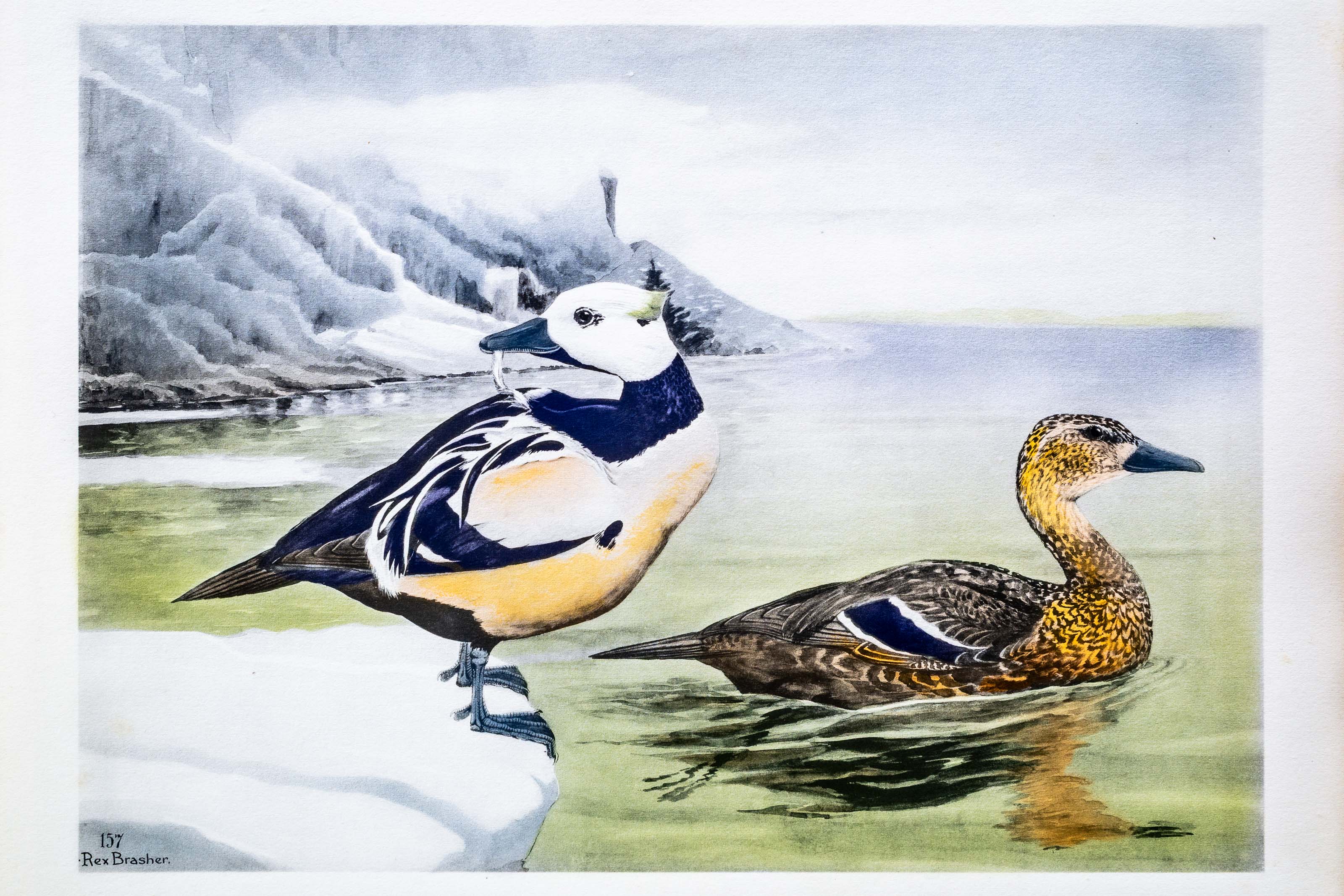 This beautiful little EIDER mingles with larger species and rarely leaves the inhospitable waters adjacent to Bering Sea. They gather in great flocks on the Siberian coast and some wander across to the Alaska shores.