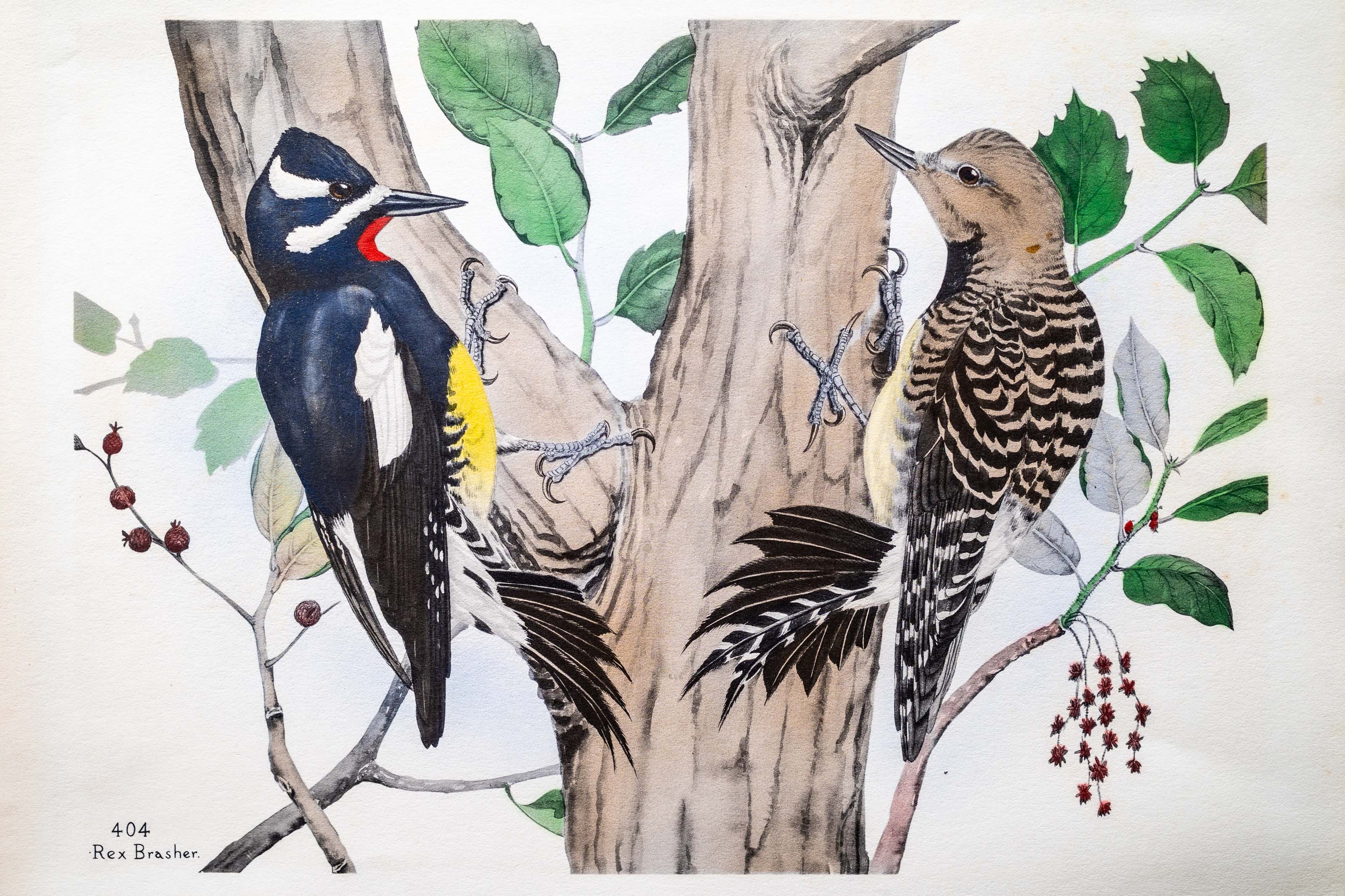 When the Sun, lassoed by an Indian boy, was burning up the Earth, Woodpeckers cut the rope with heir bills, their head feathers being burned red by the heat. All save WILLIAMSON SAPSUCKER helped save the world — he staid behind a tree and so has no accolade. His consort was formerly the Brownhead Woodpecker — a natural mistake for no other Woodpeckers show such variation in color between sexes. Some observers state they can be identified by their taps — two followed by four.