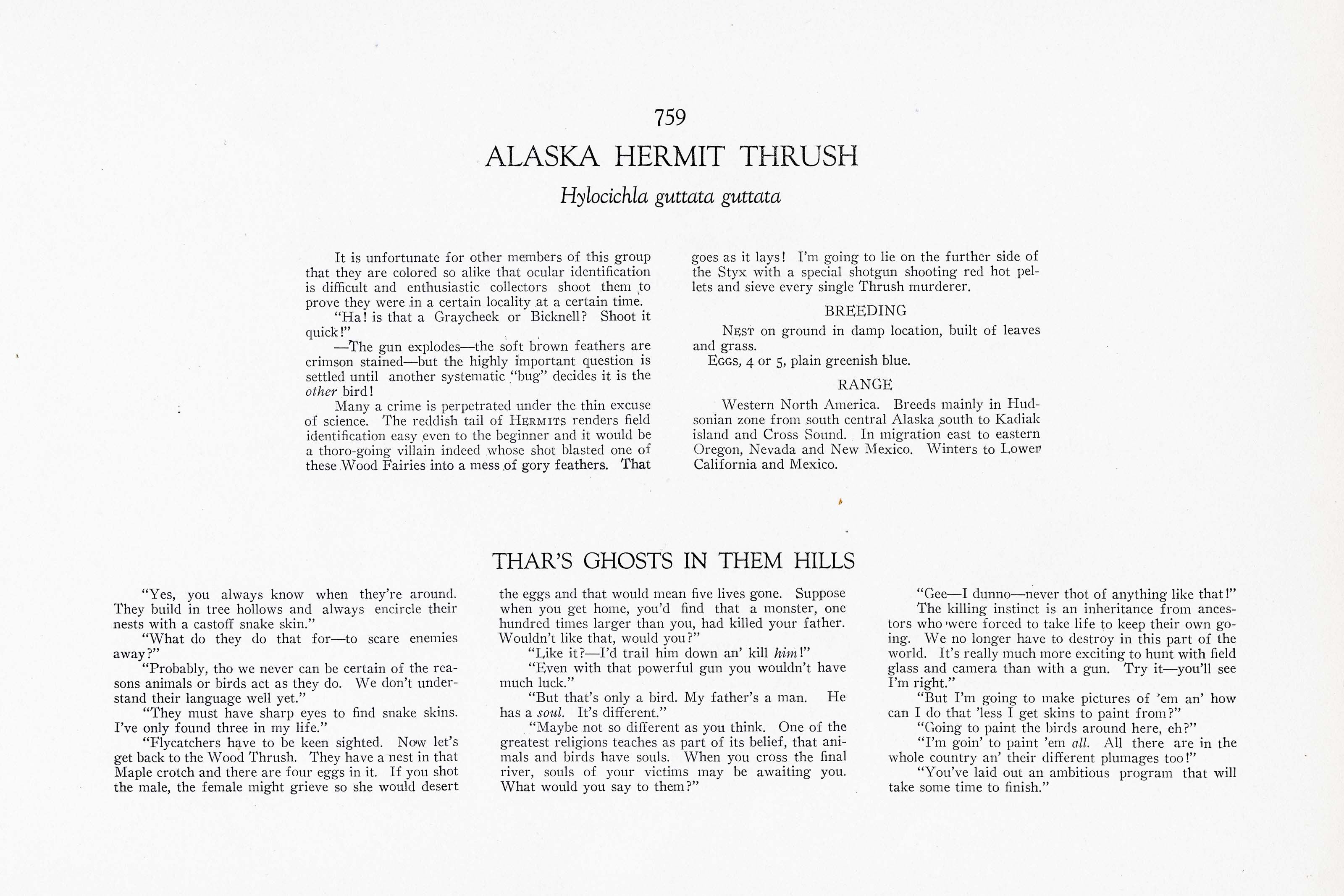 Many a crime is perpetrated under the thin excuse of science. of science. The reddish tail of HERMITS renders field identification easy even to the beginner and it would be a thoro-going villain indeed whose shot blasted one of these Wood Fairies into a mess of gory feathers. That goes as it lays! I'm going to lie on the further side of the Styx with a special shotgun shooting red hot pellets and sieve every single Thrush murderer.