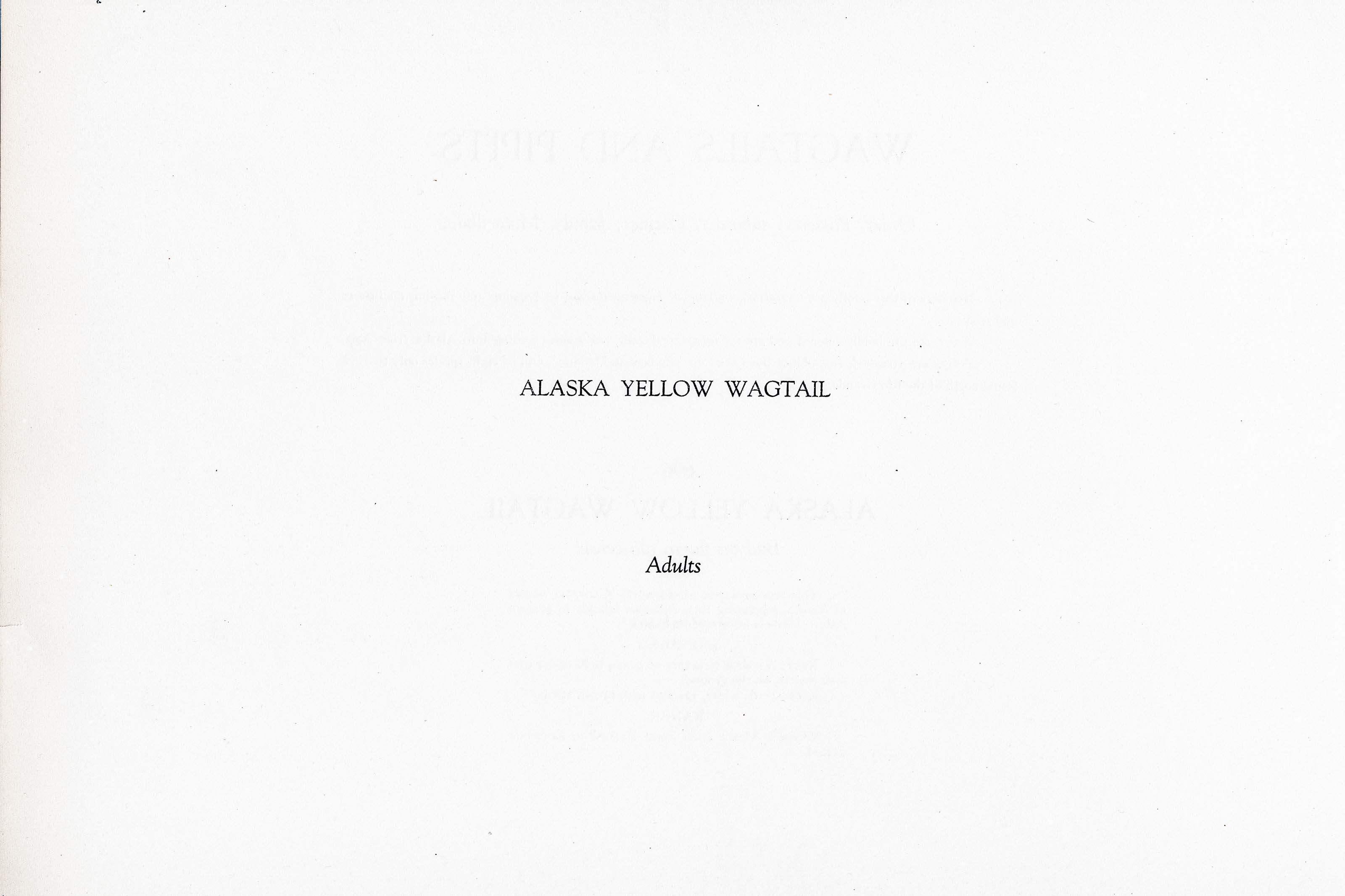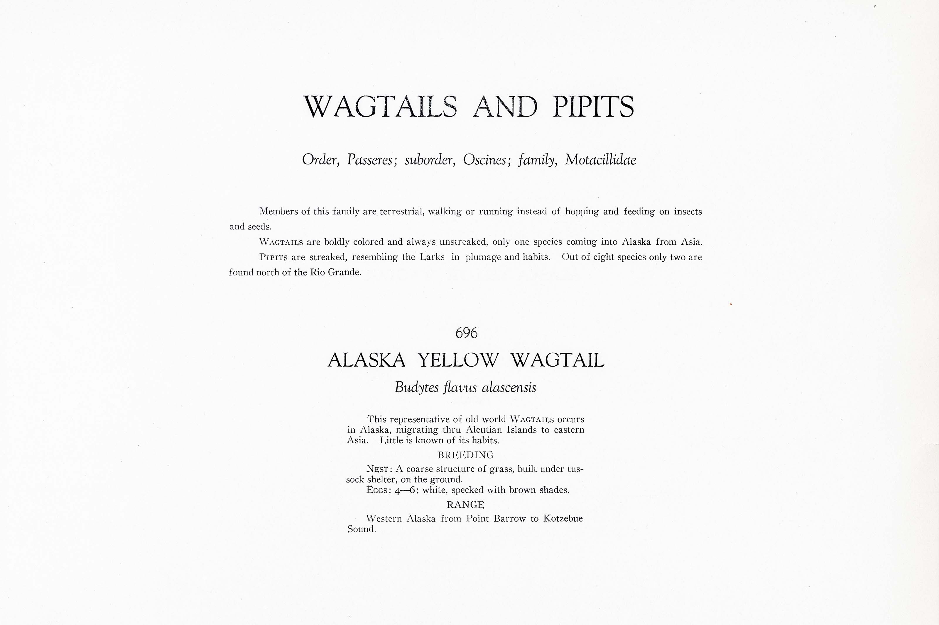 This representative of old world WAGTAILS occurs in Alaska, migrating thru Aleutian Islands to eastern Asia. Little is known of its habits.
