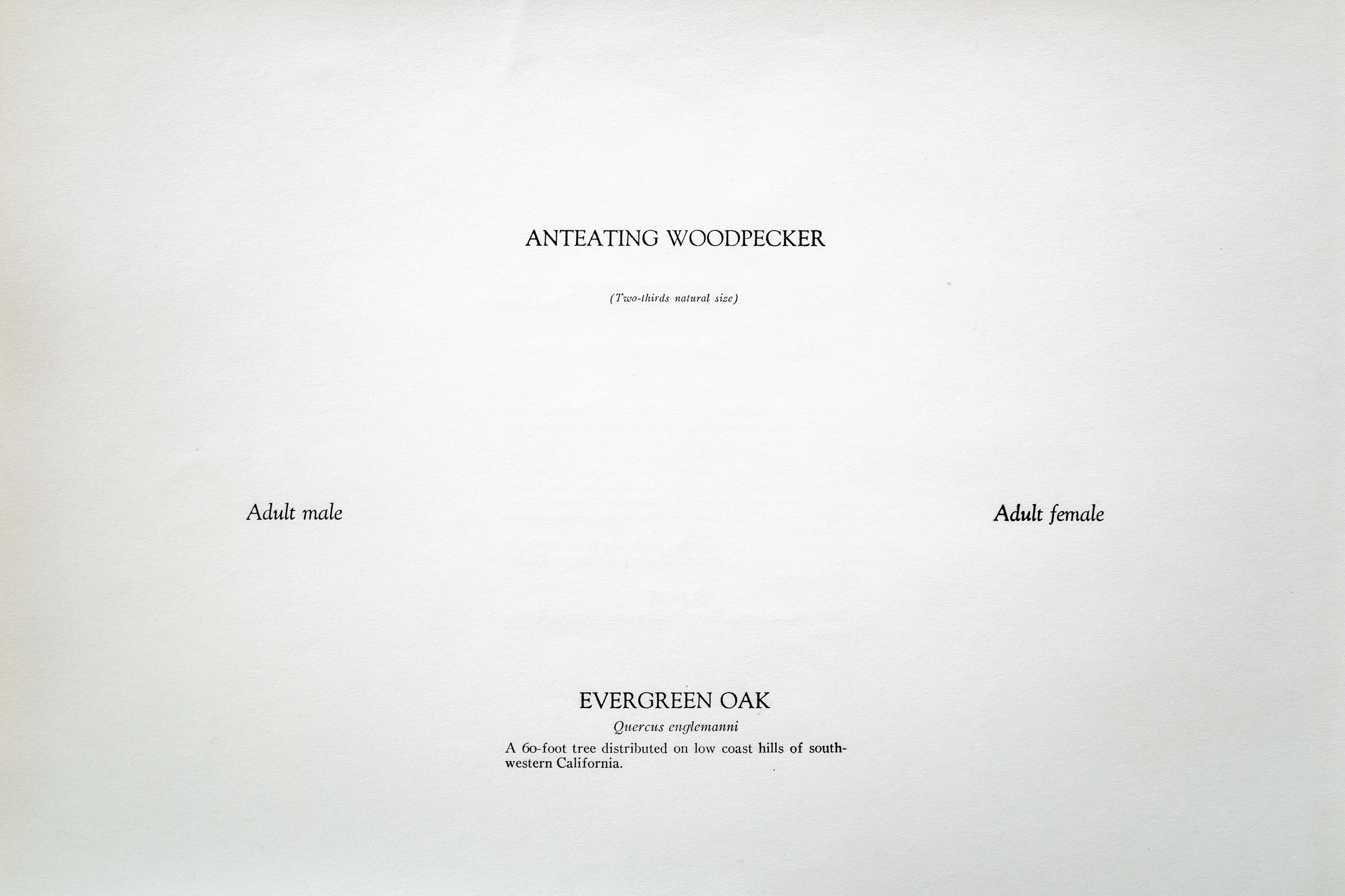 The most conspicuous trait of these Woodpeckers is their habit of boring holes in tree trunks and storing acorns therein. The reason for this carpentry has been widely discussed by ornithological savants and like many other queries about bird "reason," the true answer still remains a matter of individual conviction. It has been stated that they know each acorn contains a grub that will grow and after a time the birds return and consume the enlarged tidbit.