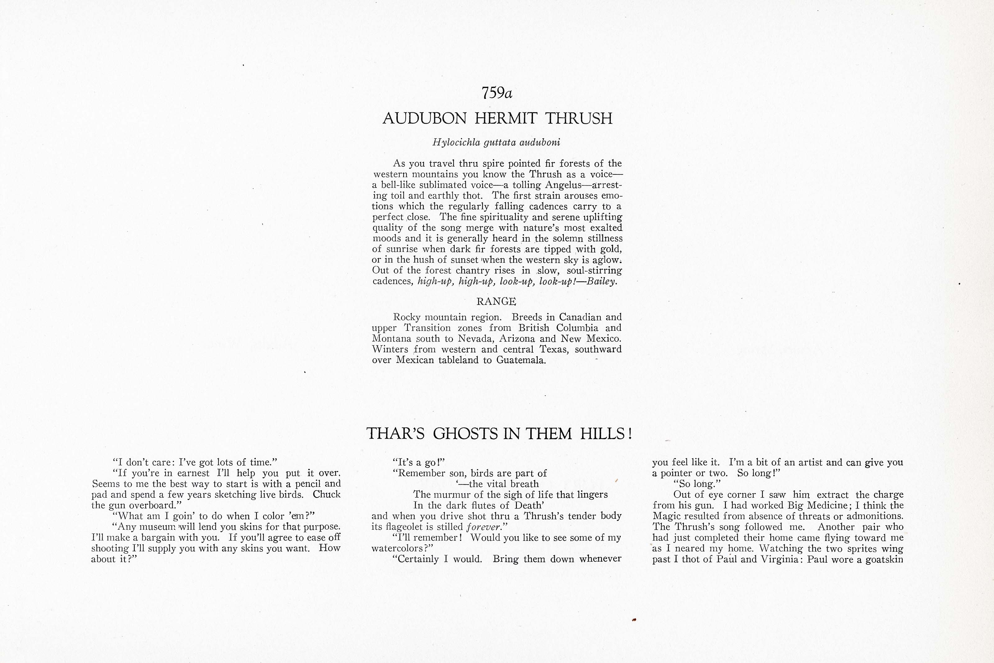 As you travel thru spire pointed fir forests of the western mountains you know the Thrush as a voice — a bell-like sublimated voice — a tolling Angelus — arresting toil and earthly thot. The first strain arouses emotions which the regularly falling cadences carry to a perfect close. The fine spirituality and serene uplifting quality of the song merge with nature's most exalted moods and it is generally heard in the solemn stillness of sunrise when dark fir forests are tipped with gold, or in the hush of sunset when the western sky is aglow. Out of the forest chantry rises in slow, soul-stirring cadences, high-up, high-up, look-up, look-up!Bailey.