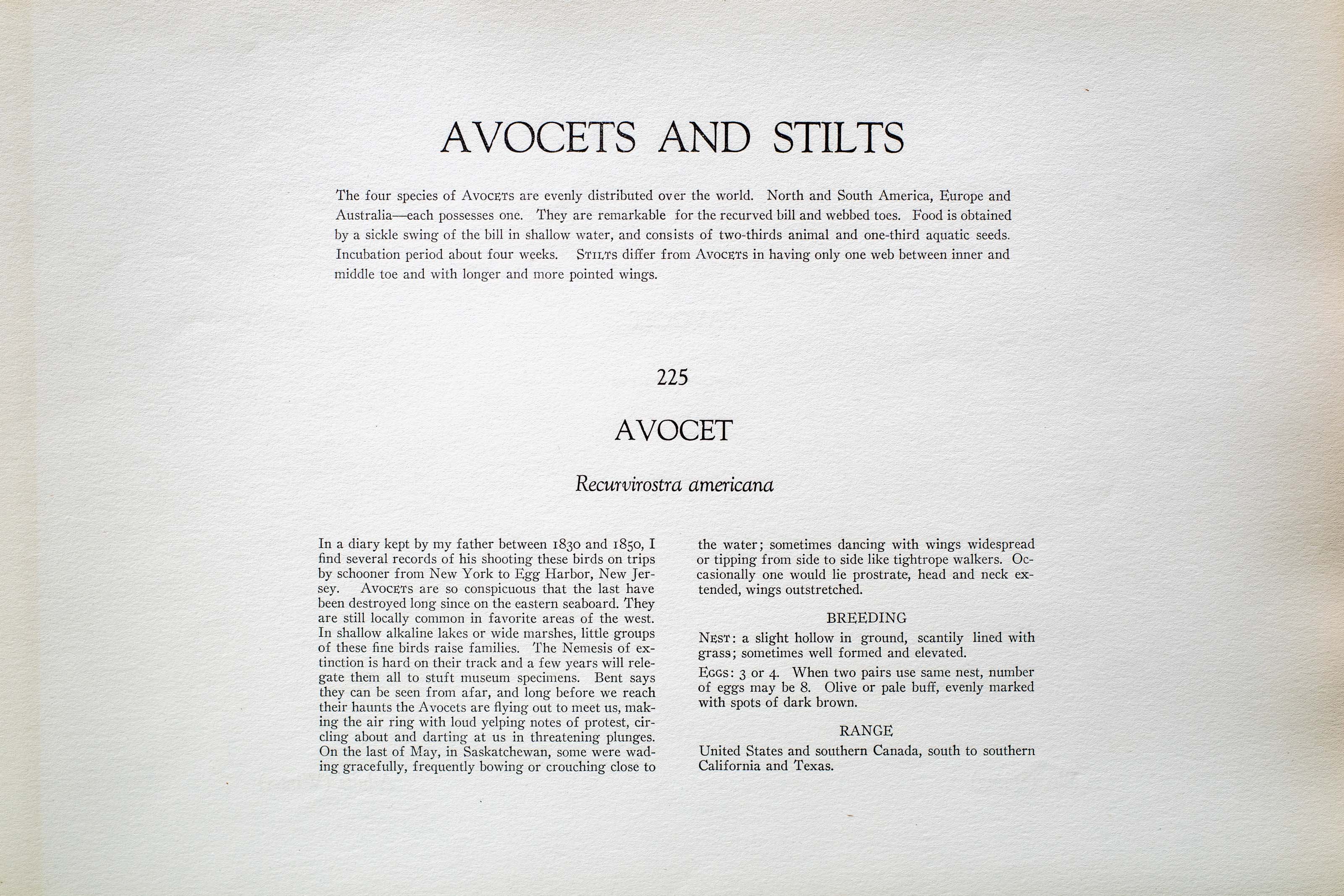 In a diary kept by my father between 1830 and 1850, I find several records of his shooting these birds on trips by schooner from New York to Egg Harbor, New Jersey. AVOCETS are so conspicuous that the last have been destroyed long since on the eastern seaboard. They are still locally common in favorite areas of the west. In shallow alkaline lakes or wide marshes, little groups of these fine birds raise families. The Nemesis of extinction is hard on their track and a few years will relegate them all to stuft museum specimens. Bent says they can be seen from afar, and long before we reach their haunts the Avocets are flying out to meet us, making the air ring with loud yelping notes of protest, circling about and darting at us in threatening plunges. On the last of May, in Saskatchewan, some were wading gracefully, frequently bowing or crouching close to the water; sometimes dancing with wings widespread or tipping from side to side like tightrope walkers. Occasionally one would lie prostrate, head and neck extended, wings outstretched.