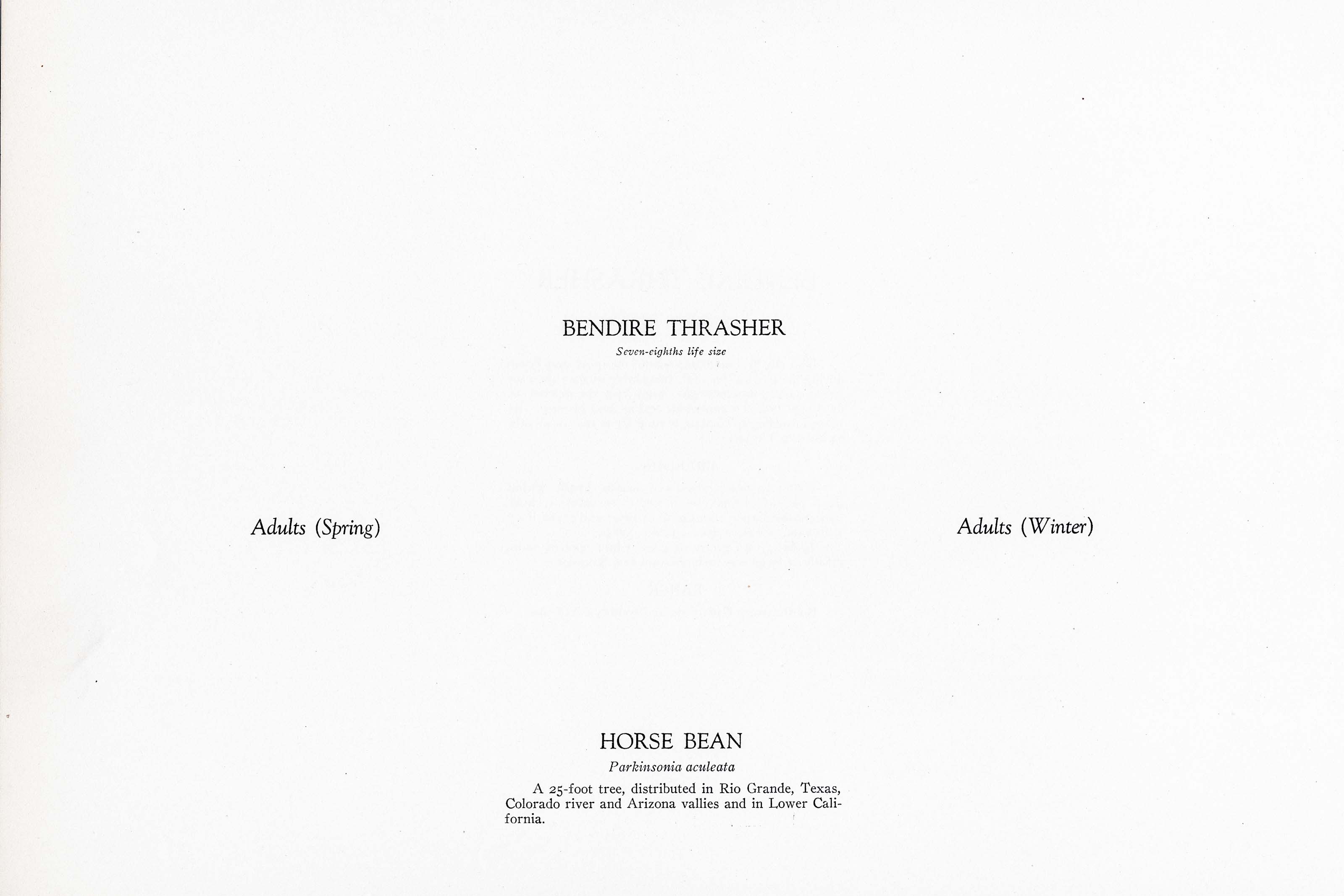 Tho shy and skulking behind mesquite and brush during the Fall and Winter, these birds become quite sociable during the summer. They visit the vicinity of dwellings and, if unmolested, nest in their vicinity. Its song, according to Gilman, is superior to that of all other western Thrashers.
