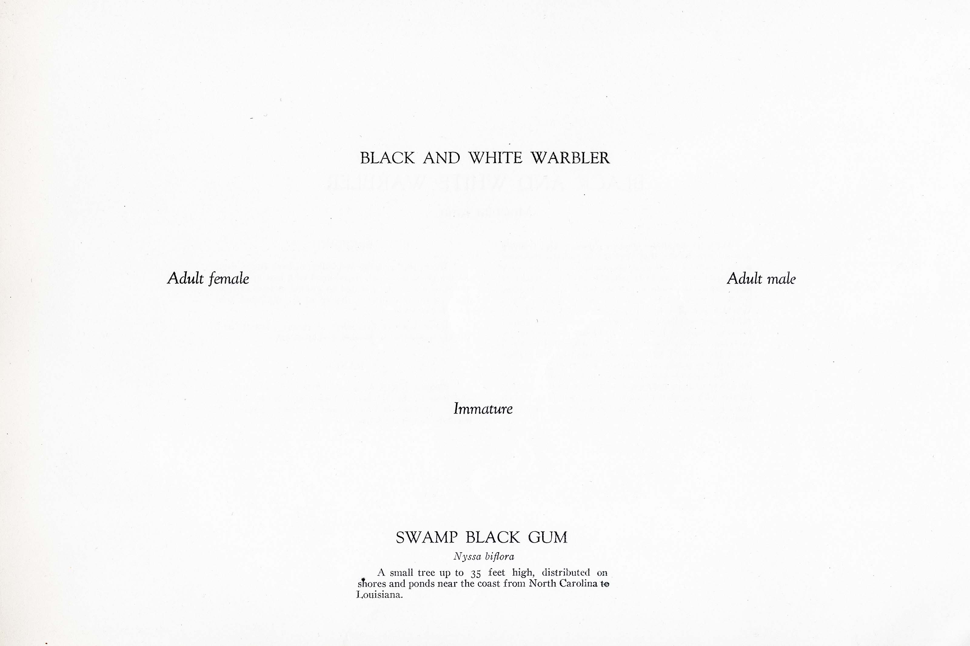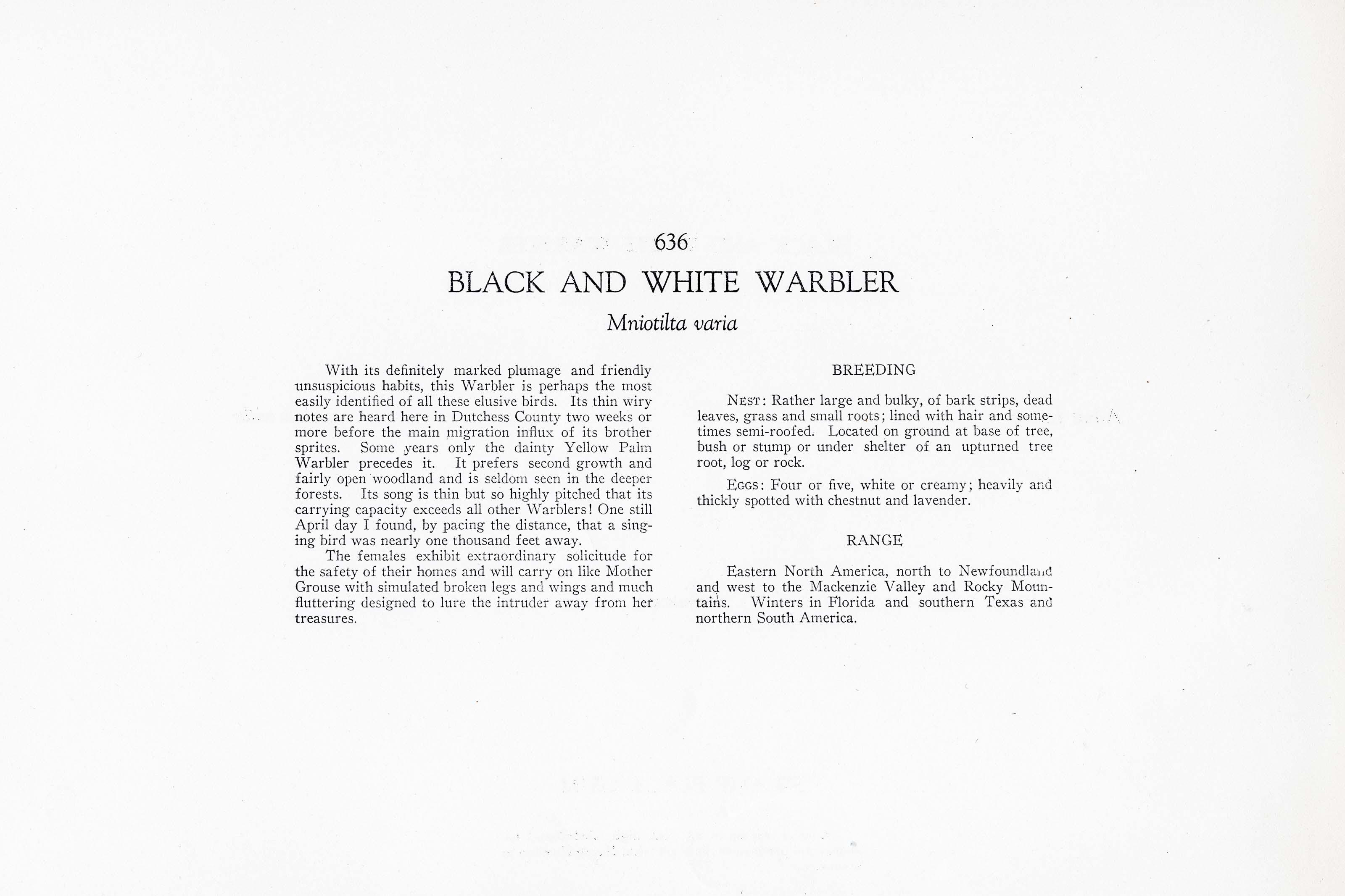 With its definitely marked plumage and friendly unsuspicious habits, this Warbler is perhaps the most easily identified of all these elusive birds. Its thin wiry notes are heard here in Dutchess County two weeks or more before the main migration influx of its brother sprites. Some years only the dainty Yellow Palm Warbler precedes it. It prefers second growth and fairly open woodland and is seldom seen in the deeper forests. Its song is thin but so highly pitched that its carrying capacity exceeds all other Warblers! One still April day I found, by pacing the distance, that a singing bird was nearly one thousand feet away.