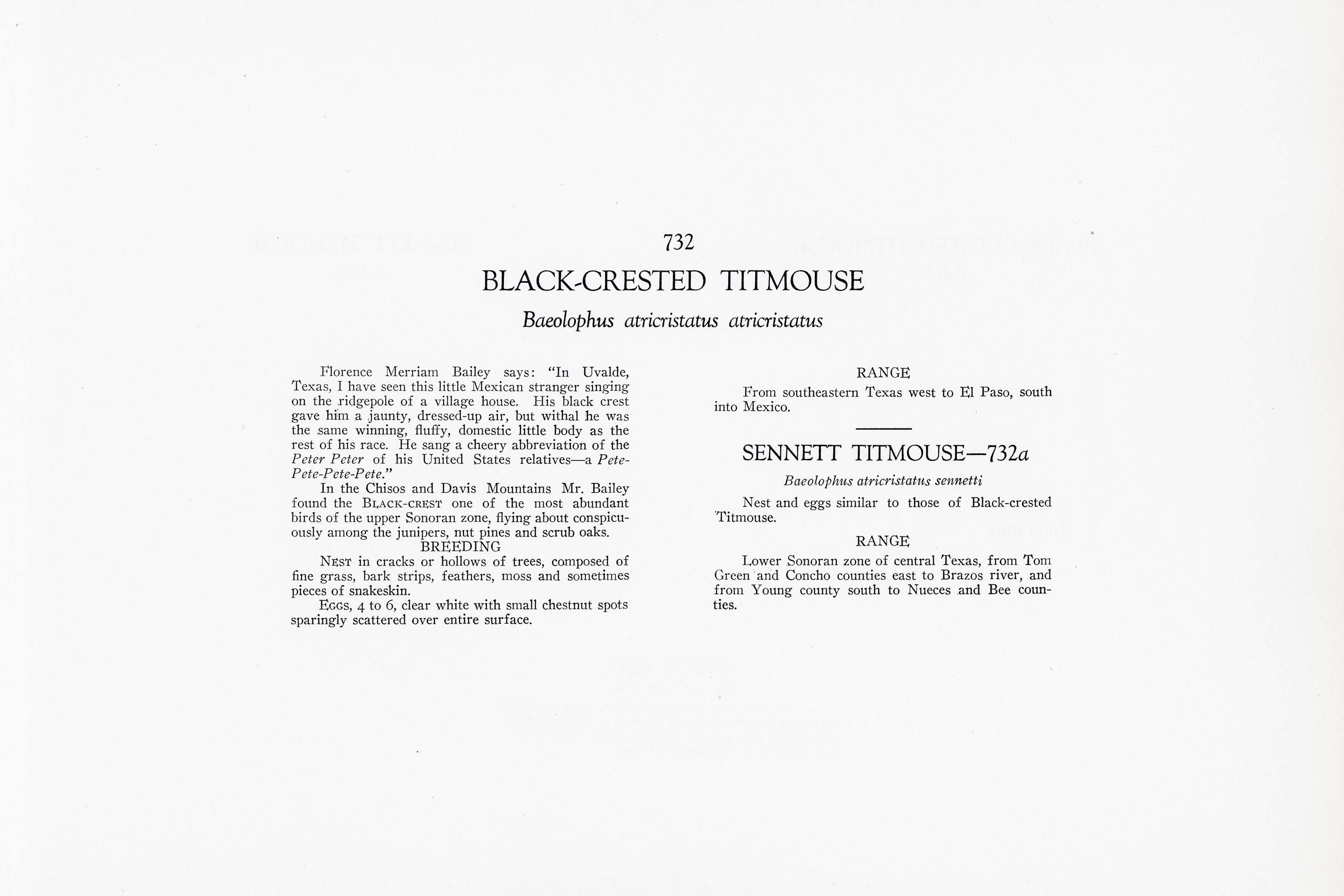 In the Chisos and Davis Mountains Mr. Bailey found the BLACK-CREST one of the most abundant birds of the upper Sonoran zone, flying about conspicuously among the junipers, nut pines and scrub oaks.