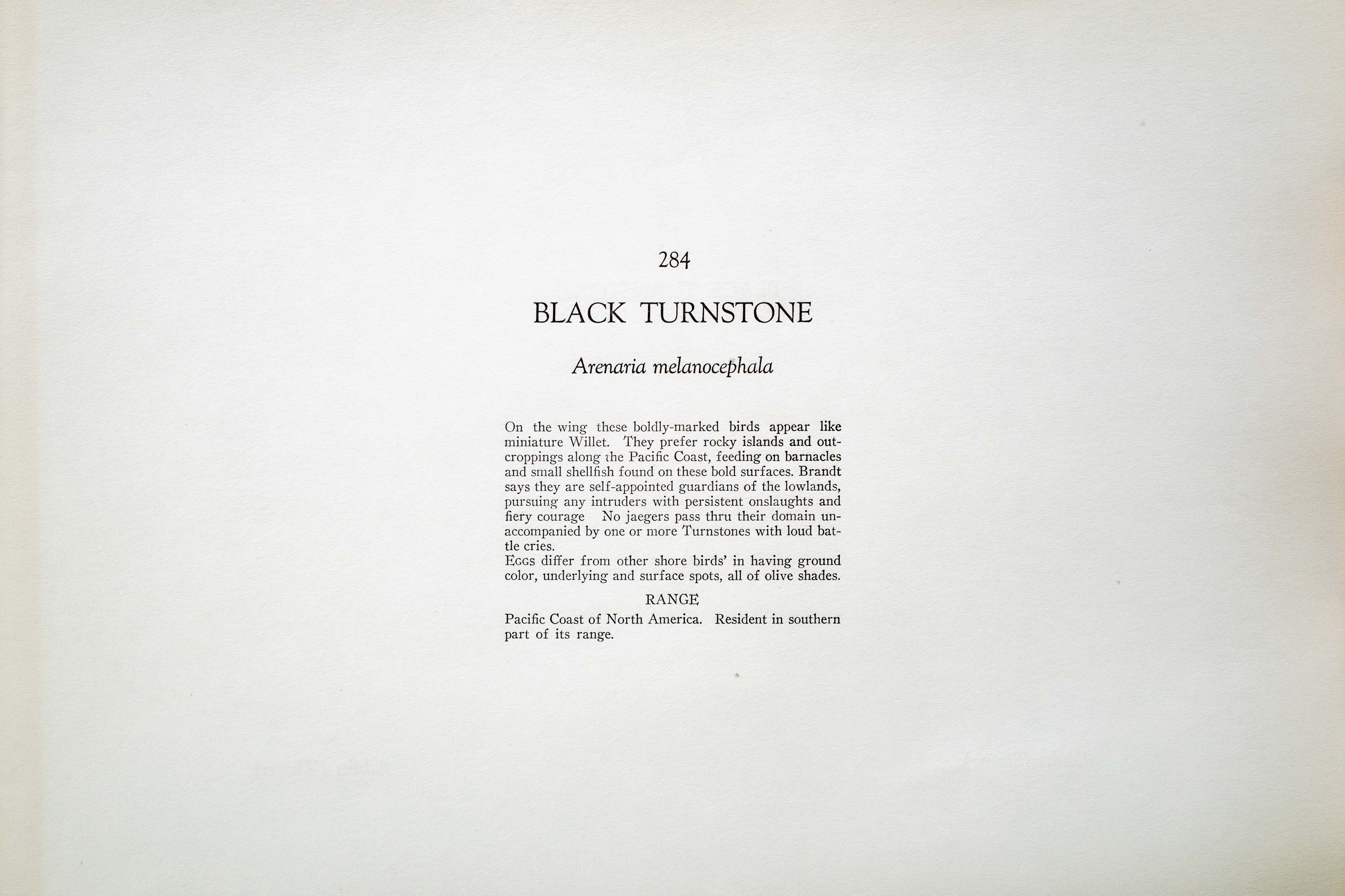 On the wing these boldly-marked birds appear like miniature Willet. They prefer rocky islands and outcroppings along the Pacific Coast, feeding on barnacles and small shellfish found on these bold surfaces. Brandt says they are self-appointed guardians of the lowlands, pursuing any intruders with persistent onslaughts and fiery courage. No jaegers pass thru their domain unaccompanied by one or more Turnstones with loud battle cries.