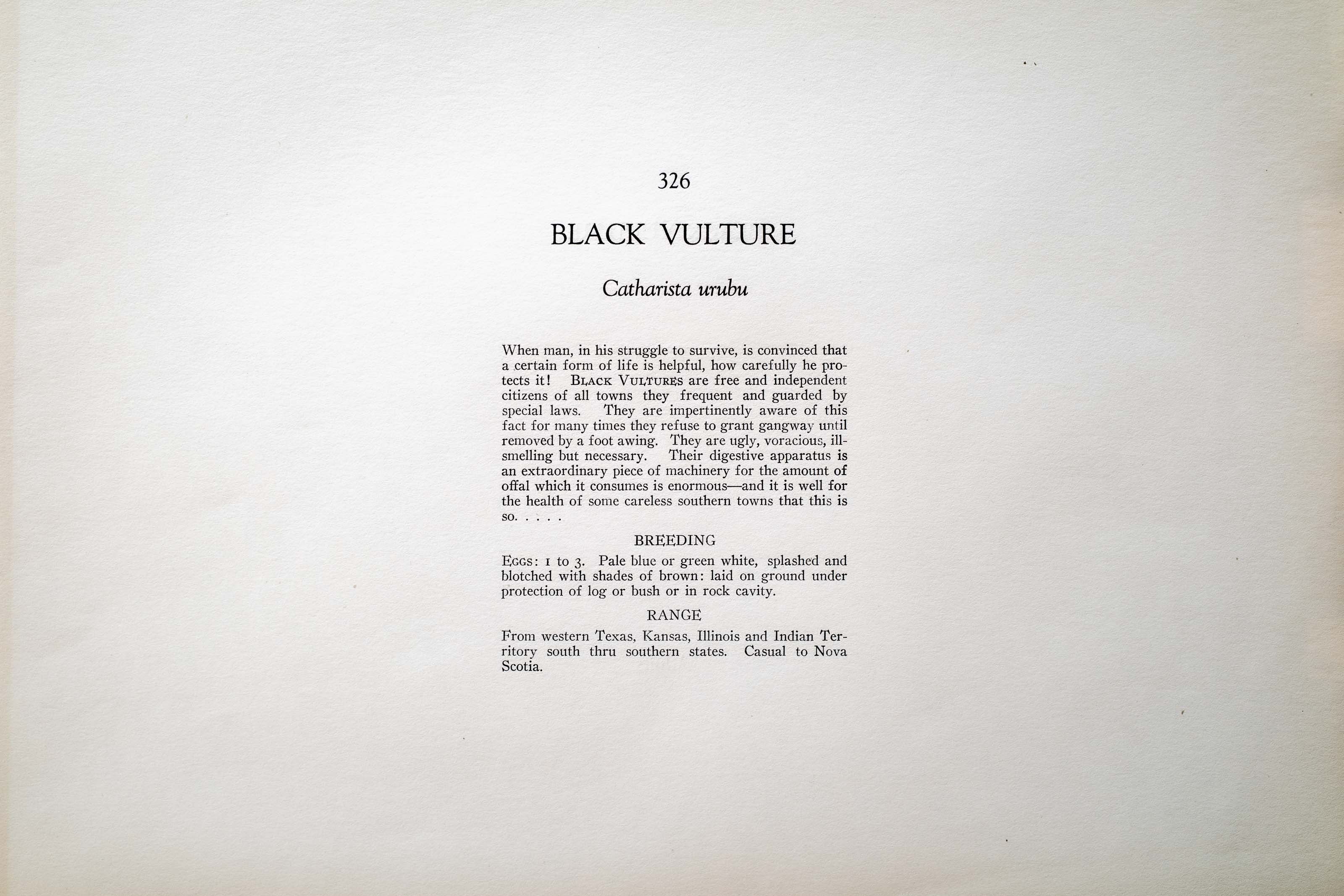 When man, in his struggle to survive, is convinced that a certain form of life is helpful, how carefully he protects it! BLACK VULTURES are free and independent citizens of all towns they frequent and guarded by special laws. They are impertinently aware of this fact for many times they refuse to grant gangway until removed by a foot awing. They are ugly, voracious, ill-smelling but necessary. Their digestive apparatus is an extraordinary piece of machinery for the amount of offal which it consumes is enormous — and it is well for the health of some careless southern towns that this is so. . . . .