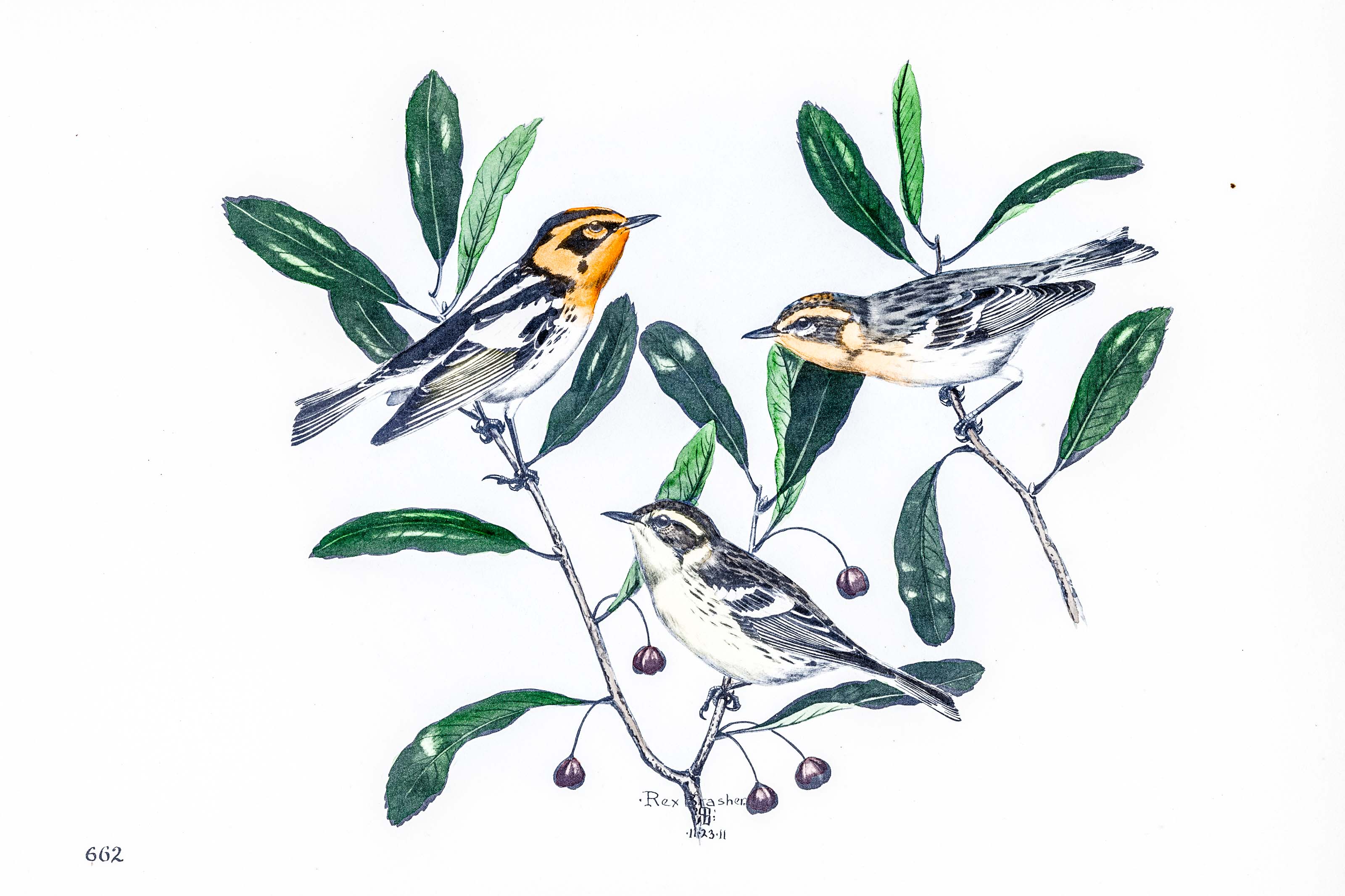To see a male BLACKBURNIAN against the dark green hemlock foliage is an event which gives the oldest ornithologist a thrill. They love the high trees but the brilliant orange in their plumage renders them conspicuous and perhaps one of the most easily identified of the Warblers.