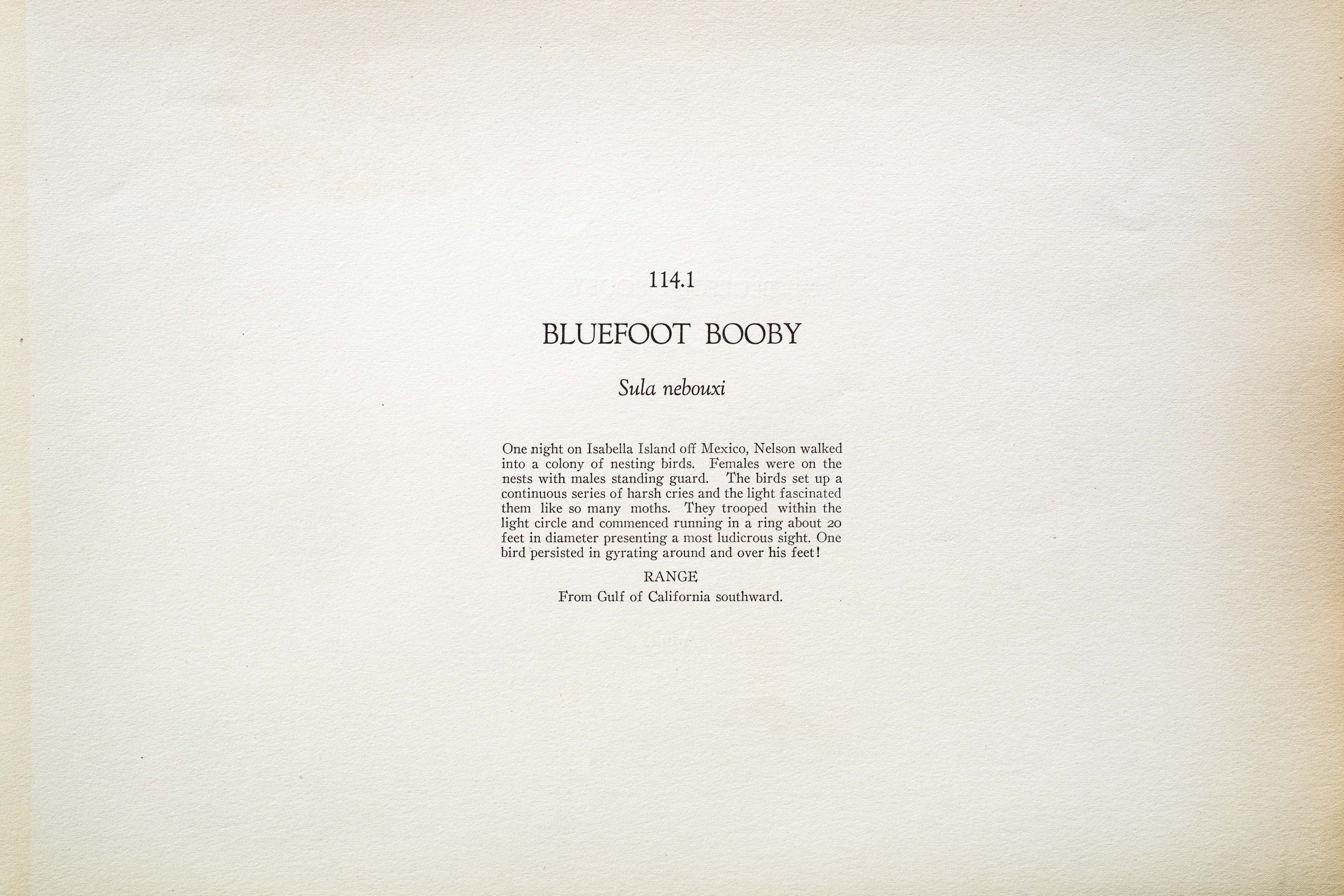 One night on Isabella Island off Mexico, Nelson walked into a colony of nesting birds. Females were on the nests with males standing guard. The birds set up a continuous series of harsh cries and the light fascinated them like so many moths. They trooped within the light circle and commenced running in a ring about 20 feet in diameter presenting a most ludicrous sight. One bird persisted in gyrating around and over his feet!