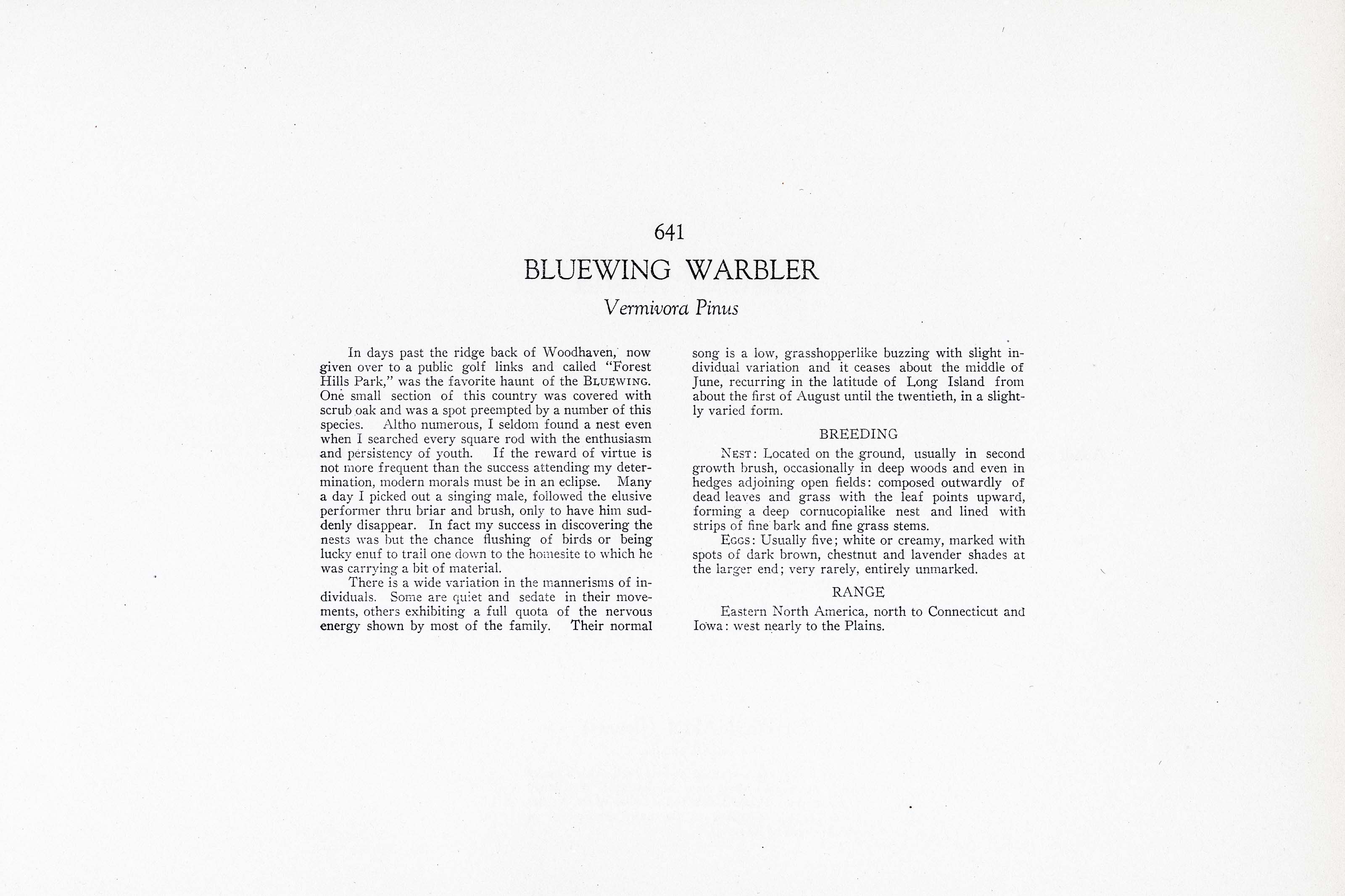 In days past the ridge back of Woodhaven, now given over to a public golf links and called "Forest Hills Park," was the favorite haunt of the BLUEWING. One small section of this country was covered with scrub oak and was a spot preempted by a number of this species. Altho numerous, I seldom found a nest even when I searched every square rod with the enthusiasm and persistency of youth. If the reward of virtue is not more frequent than the success attending my determination, modern morals must be in an eclipse. Many a day I picked out a singing male, followed the elusive performer thru briar and brush, only to have him suddenly disappear. In fact my success in discovering the nests was but the chance flushing of birds or being lucky enuf to trail one down to the homesite to which he was carrying a bit of material.