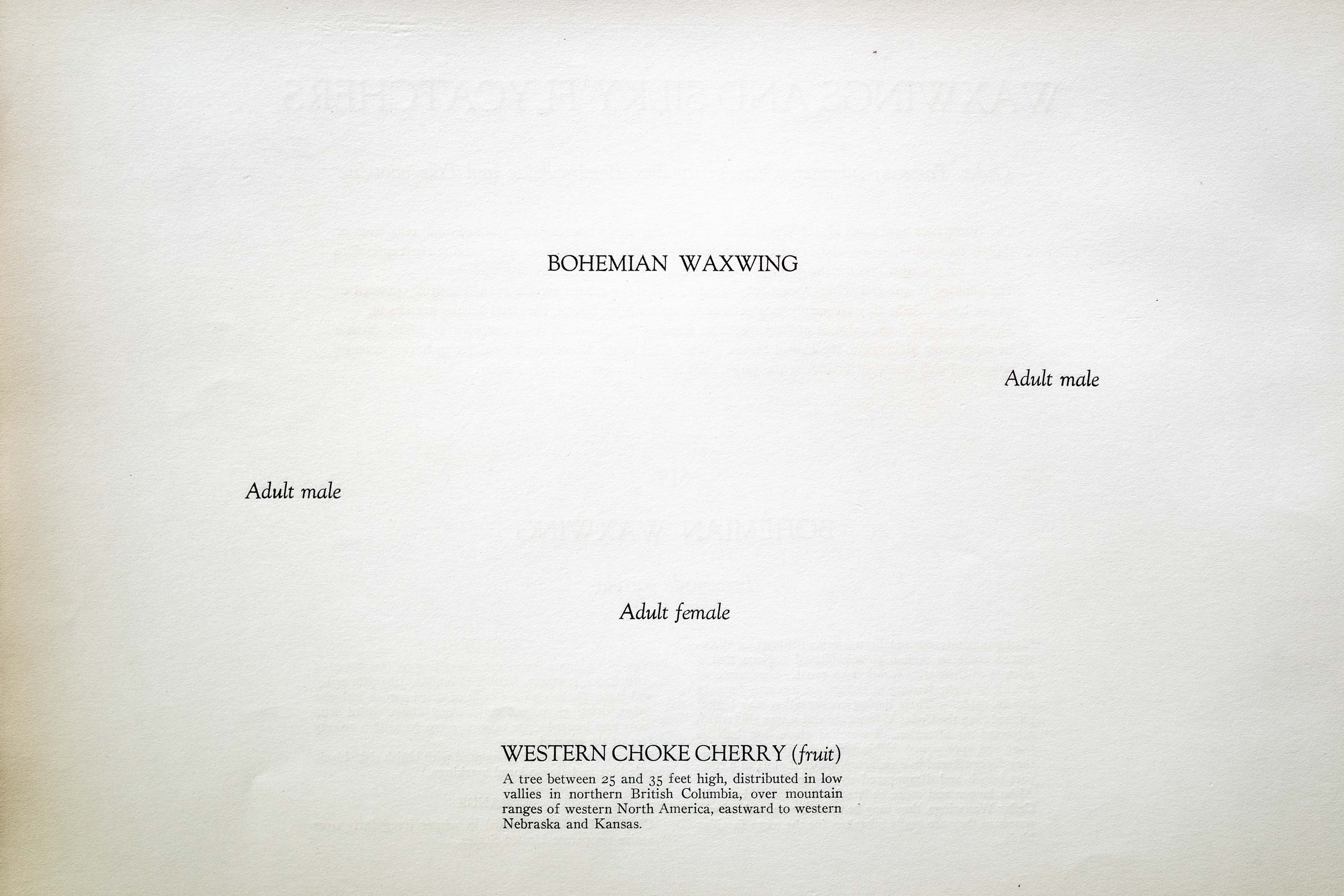 Living in coniferous northern forests BOHEMIAN WAXWINGS come so seldom to inhabited regions that a glimpse of their trim forms is an event. I encountered a flock of eight feeding in cedars, on a warm January day in 1916. Their lisping conversation was higher pitched than the Cedar Waxwings and it was this which attracted my attention. I watched them for half an hour and approached within ten feet. Breakfast over, they foregathered in a cedartop, whirled aloft in a compact bunch and disappeared southward.