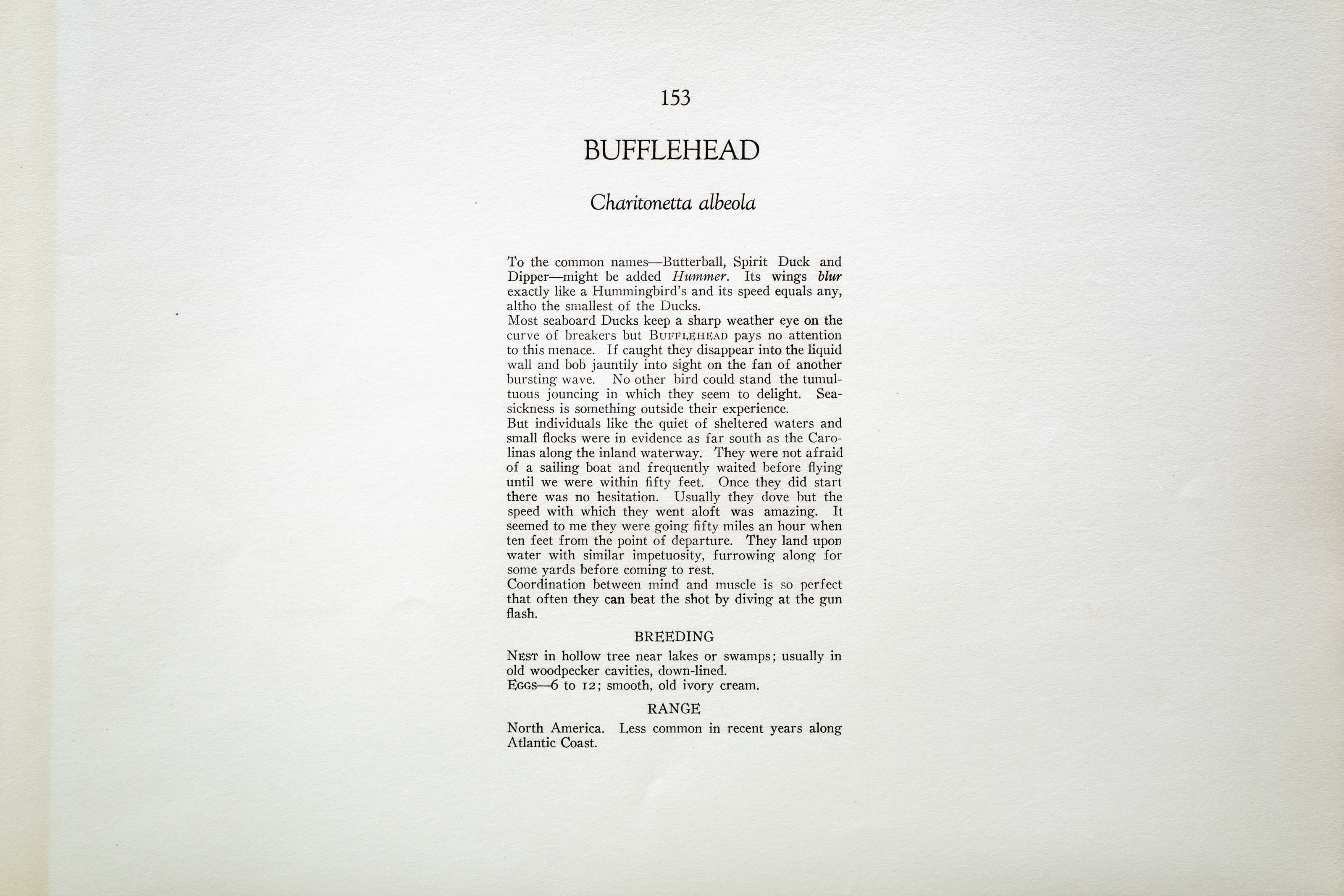 Most seaboard Ducks keep a sharp weather eye on the curve of breakers but BUFFLEHEAD pays no attention to this menace. If caught they disappear into the liquid wall and bob jauntily into sight on the fan of another bursting wave. No other bird could stand the tumultuous jouncing in which they seem to delight. Seasickness is something outside their experience.