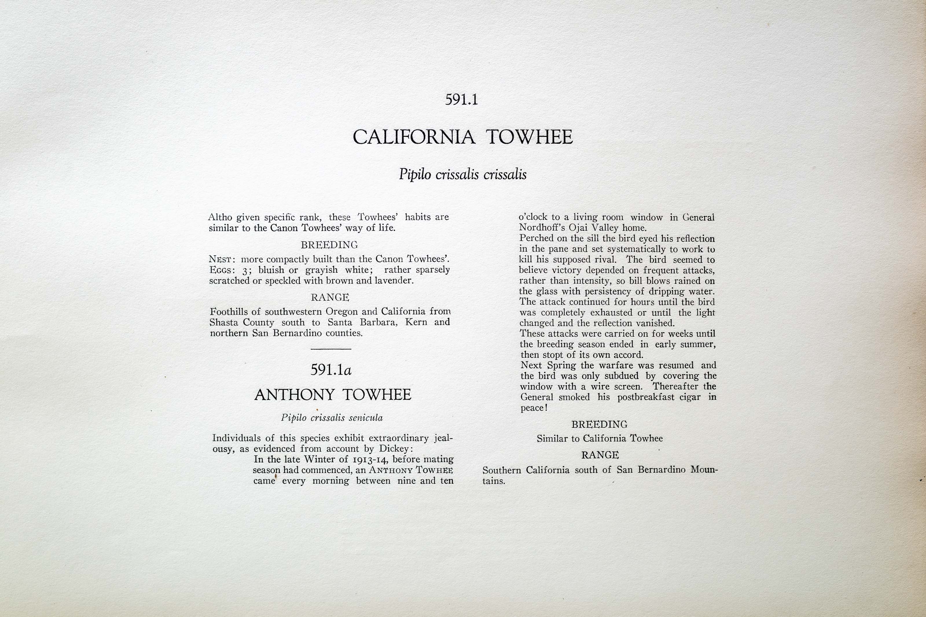 In the late Winter 1913-14, before mating season had commenced, an ANTHONY TOWHEE came every morning between nine and ten o'clock to a living room in General Nordhoff's Ojai Valley home.