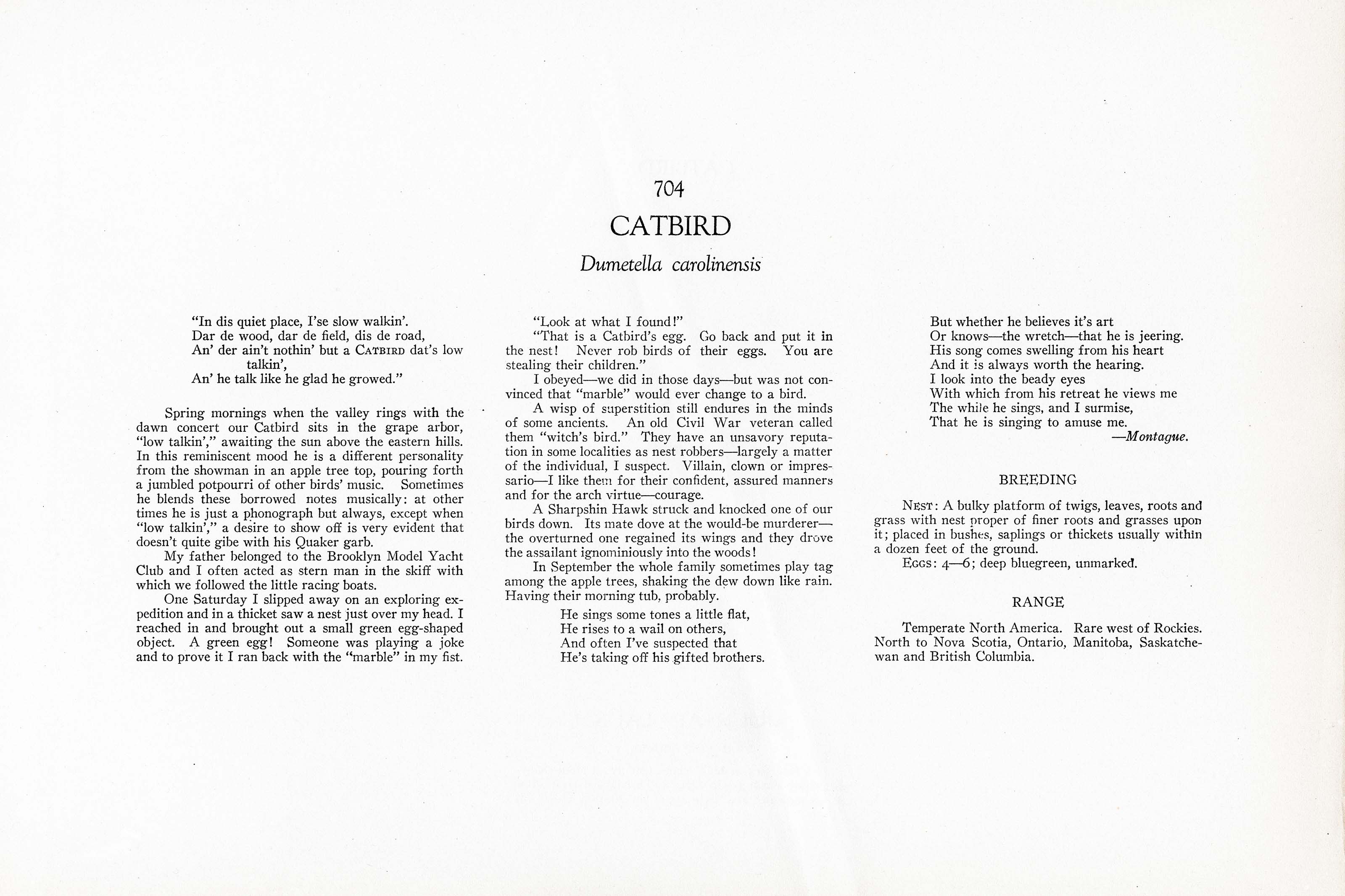 Spring mornings when the valley rings with the dawn concert our Catbird sits in the grape arbor, "low talkin'," awaiting the sun above the eastern hills. In this reminiscent mood he is a different personality from the showman in an apple tree top, pouring forth a jumbled potpourri of other birds' music. Sometimes he blends these borrowed notes musically: at other times he is just a phonograph but always, except when "low talkin'," a desire to show off is very evident that doesn't quite gibe with his Quaker garb.