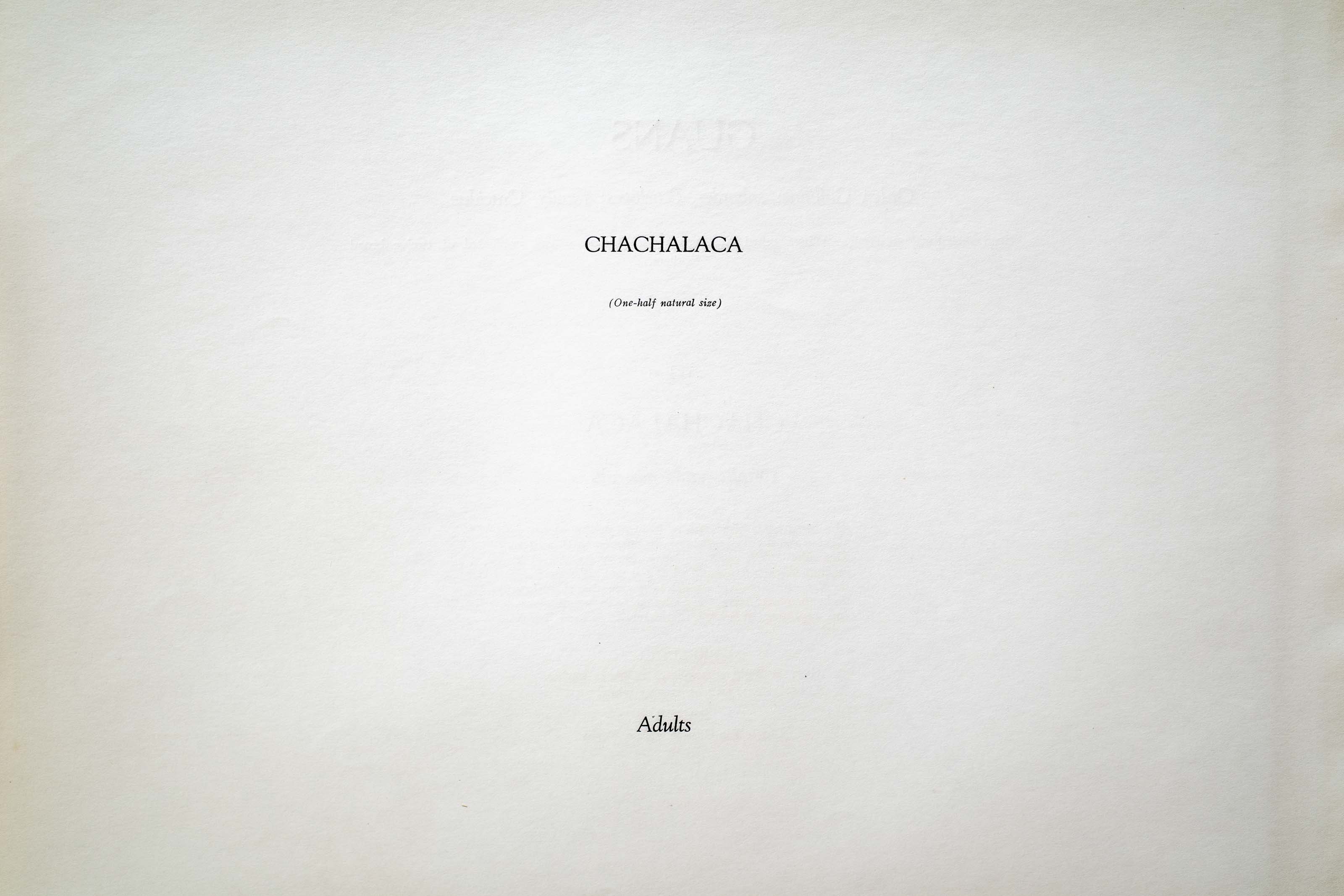 This remarkable bird often is domesticated by peons of Mexico and takes the place of our chickens with poorer Mexicans. The eggs are large — about the size of a medium chicken egg — and when fed and taken care of, the CHACHALACAS lay a much larger number than they do in their wild state. They are noisy in breeding season, repeating their name insistently in loud harsh voice.