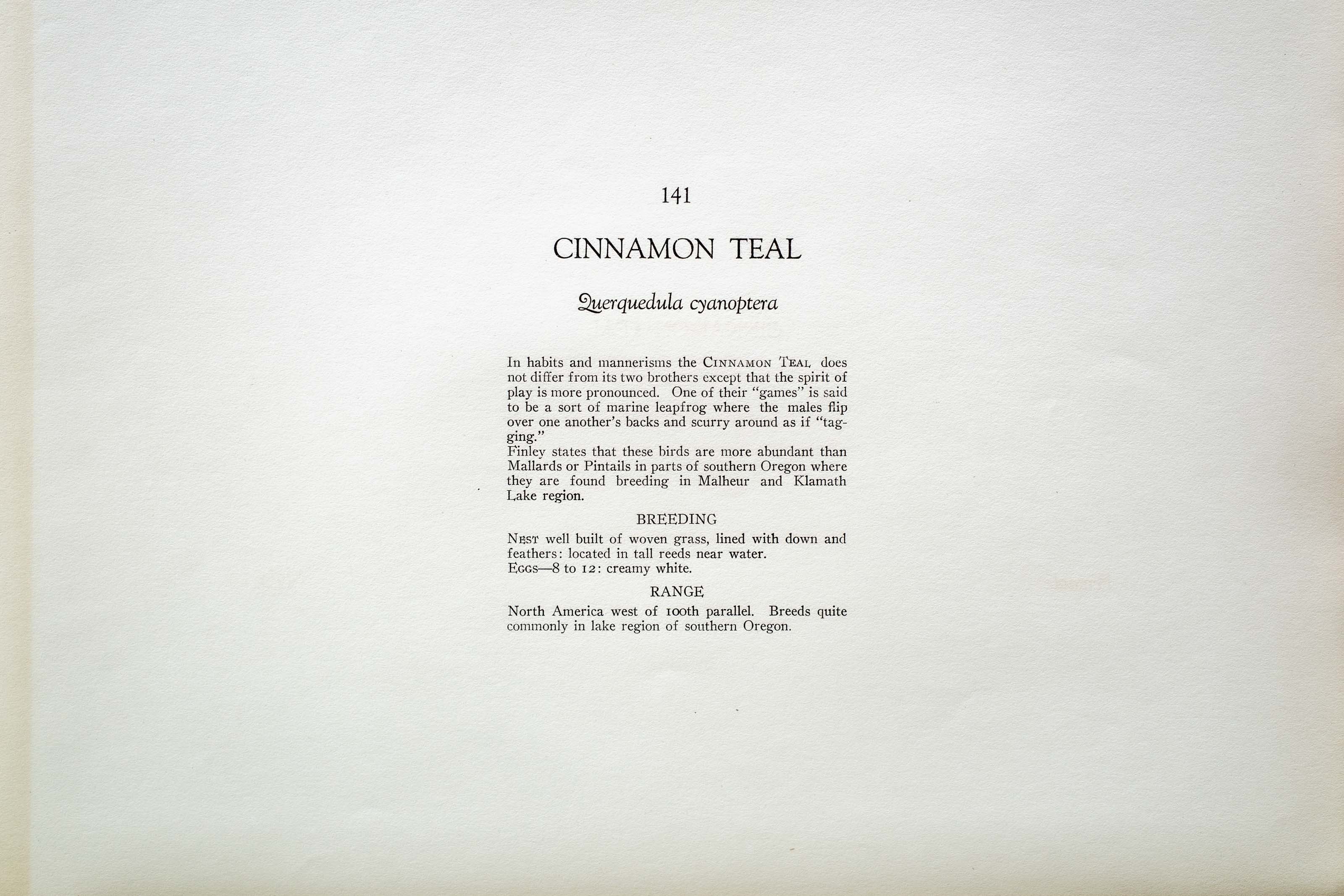 Finley states that these birds are more abundant than Mallards or Pintails in parts of southern Oregon where they are found breeding in Malheur and Klamath Lake region.