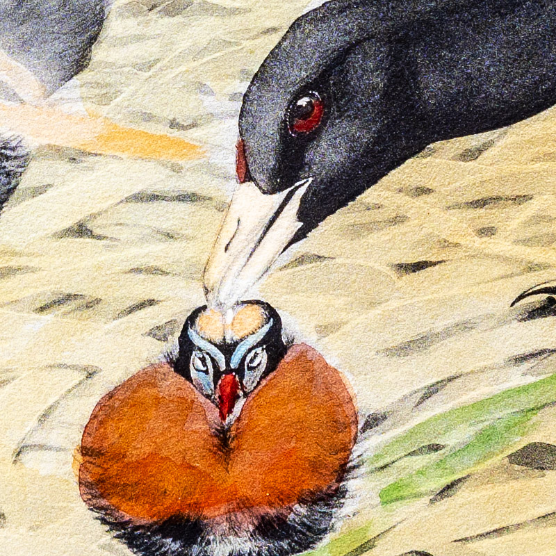 The males are extremely pugnacious during courtship, selecting a certain area as their own and driving away any intruders. They fight with bills and feet so furiously that how they escape serious injury is a mystery. The females sometimes join and stage a real battle royal but after it is over there are no warrior dead on the battle water.