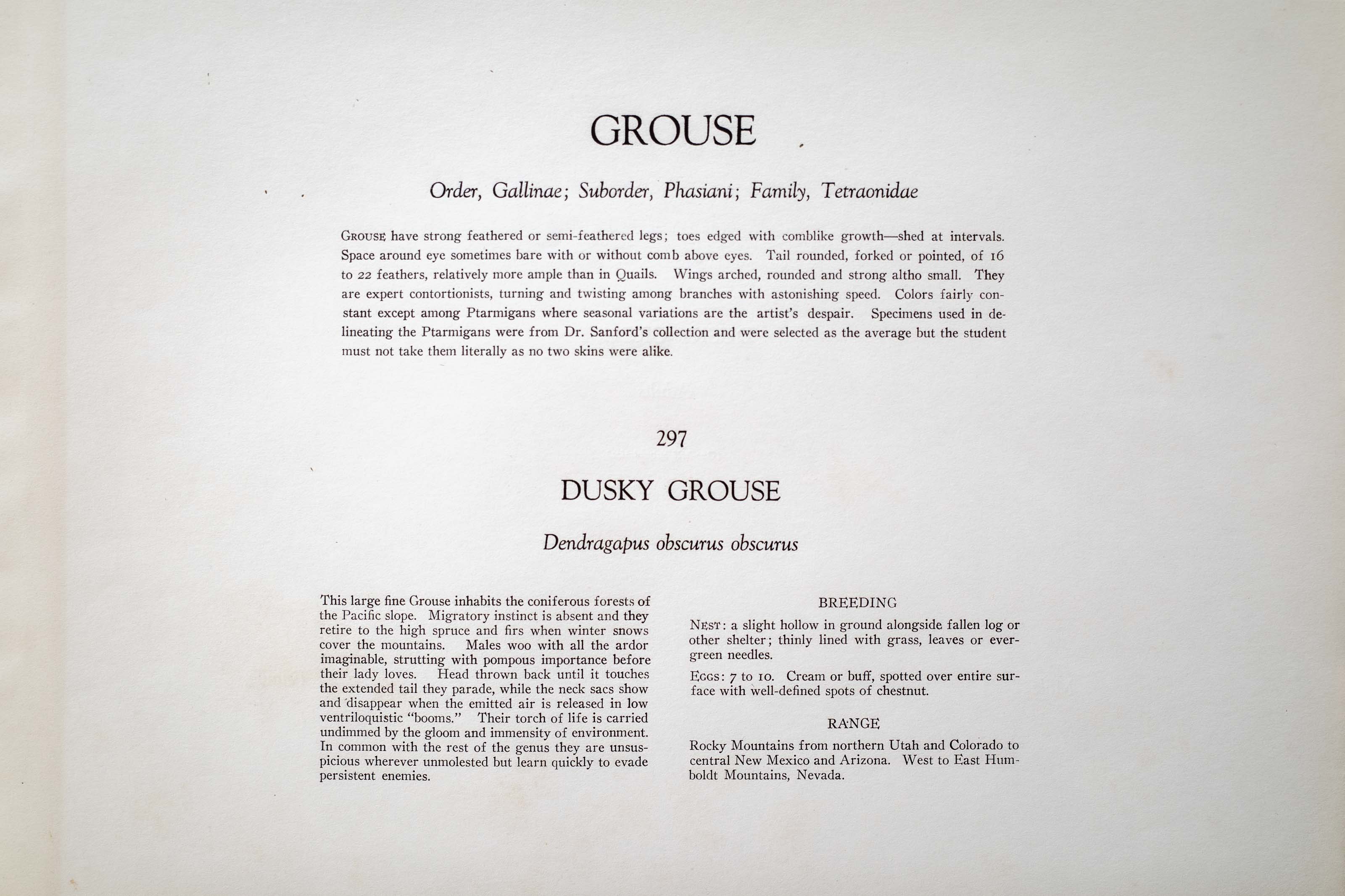 This large fine Grouse inhabits the coniferous forests of the Pacific slope. Migratory instinct is absent and they retire to the high spruce and firs when winter snows cover the mountains. Males woo with all the ardor imaginable, strutting with pompous importance before their lady loves. Head thrown back until it touches the extended tail they parade, while the neck sacs show and disappear when the emitted air is released in low ventriloquistic "booms." Their torch of life is carried undimmed by the gloom and immensity of environment. In common with the rest of the genus they are unsuspicious wherever unmolested but learn quickly to evade persistent enemies.