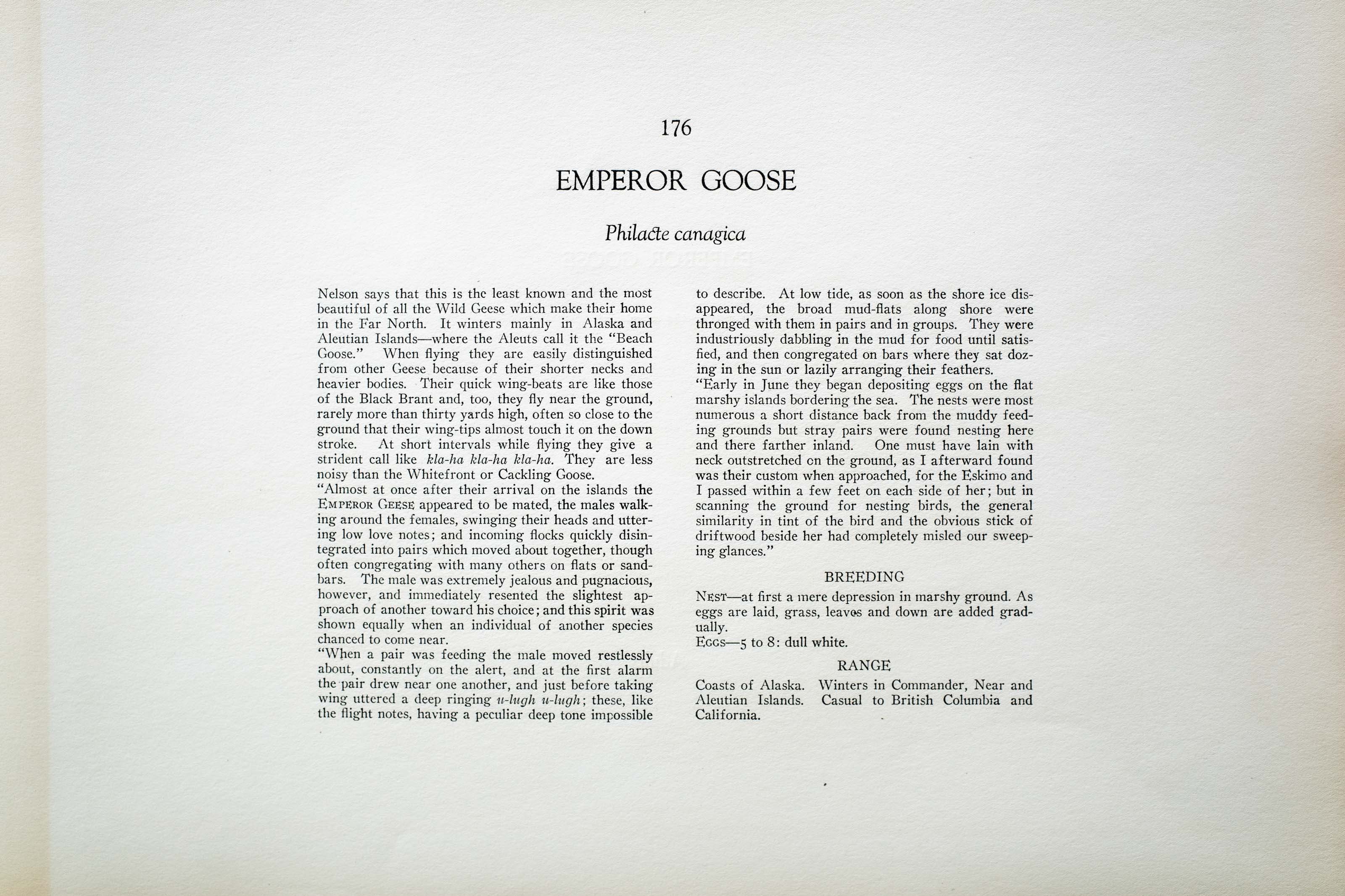 "Almost at once after their arrival on the islands the EMPEROR GEESE appeared to be mated, the males walking around the females, swinging their heads and uttering low love notes; and incoming flocks quickly disintegrated into pairs which moved about together, though often congregating with many others on flats or sandbars. The male was extremely jealous and pugnacious, however, and immediately resented the slightest approach of another toward his choice; and this spirit was shown equally when an individual of another species chanced to come near.