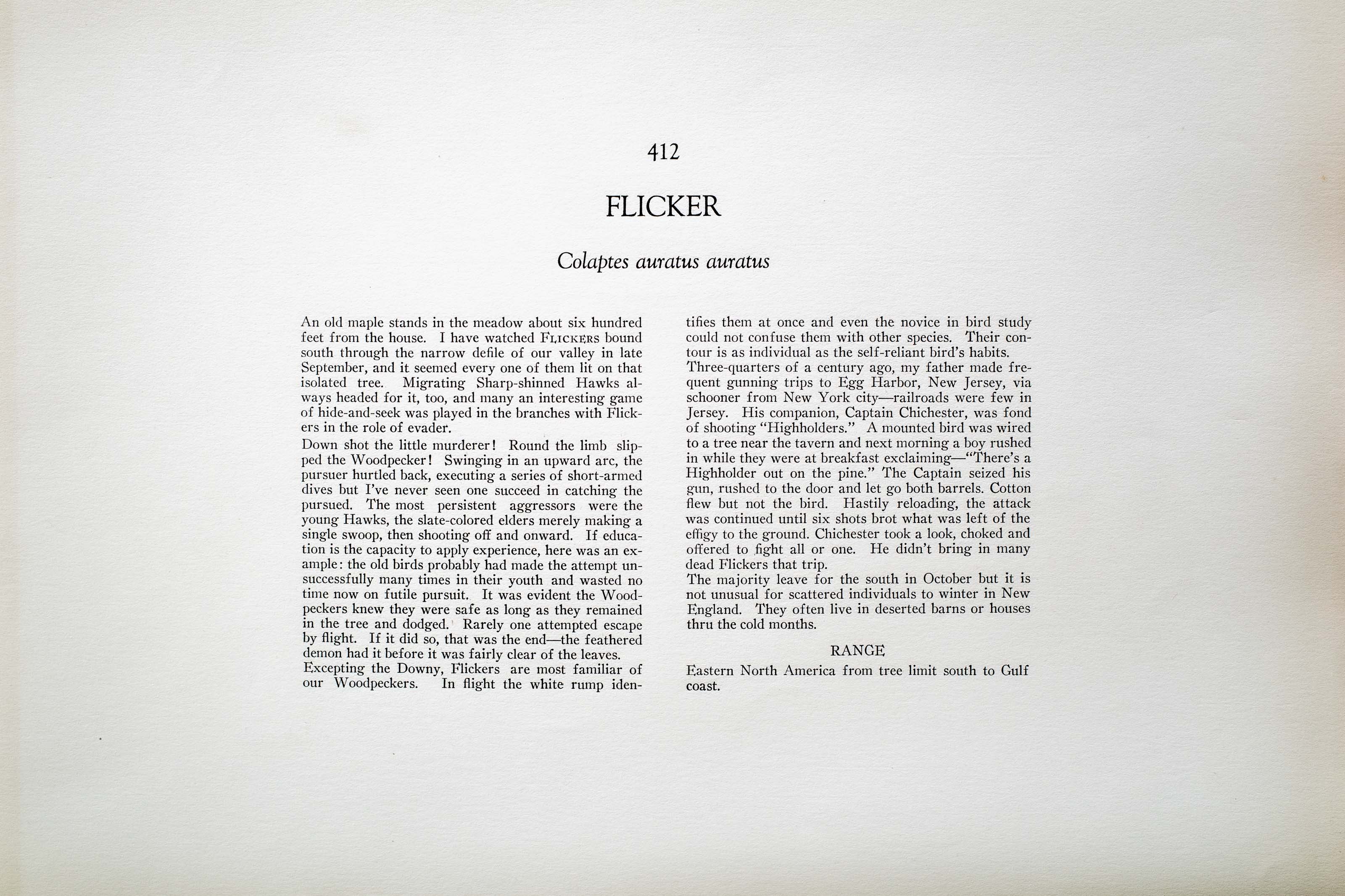 An old maple stands in the meadow about six hundred feet from the house. I have watched FLICKERS bound south through the narrow defile of our valley in late September, and it seemed every one of them lit on that isolated tree. Migrating Sharp-shinned Hawks always headed for it, too, and many an interesting game of hide-and-seek was played in the branches with Flickers in the role of evader.