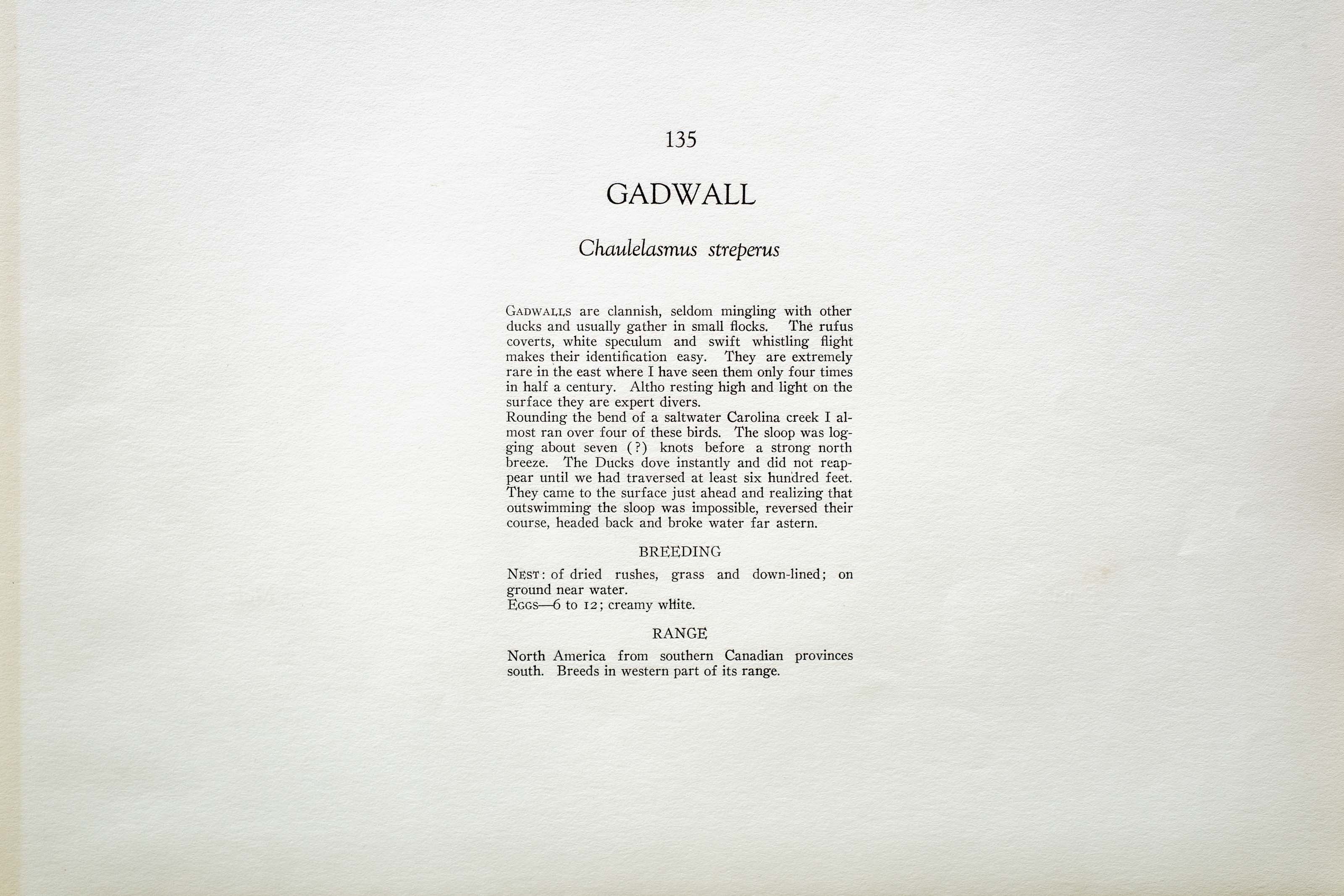 GADWALLS are clannish, seldom mingling with other ducks and usually gather in small flocks. The rufus coverts, white speculum and swift whistling flight makes their identification easy. They are extremely rare in the east where I have seen them only four times in half a century. Altho resting high and light on the surface they are expert divers.