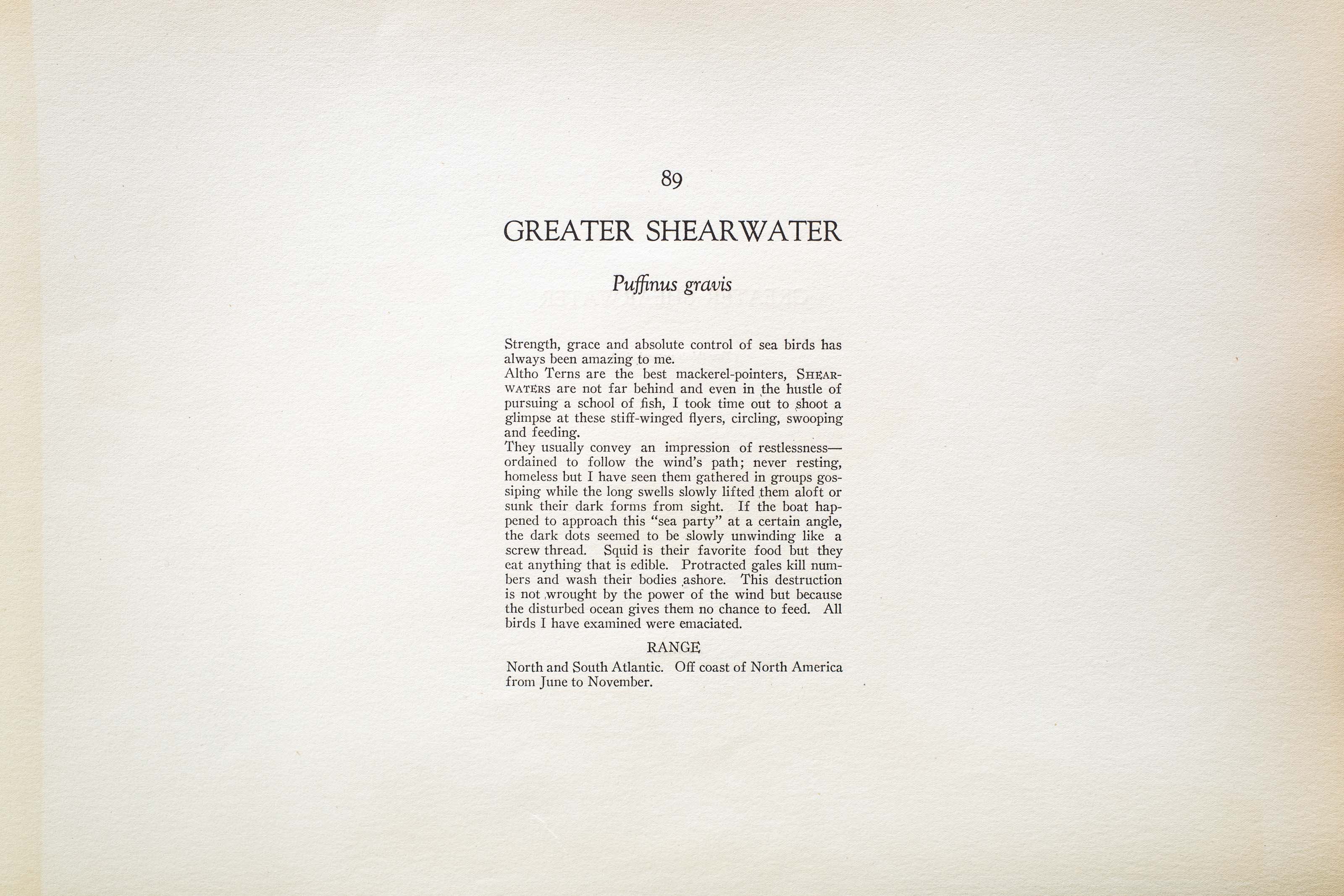 They usually convey an impression of restlessness — ordained to follow the wind's path; never resting, homeless but I have seen them gathered in groups gossiping while the long swells slowly lifted them aloft or sunk their dark forms from sight. If the boat happened to approach this "sea party" at a certain angle, the dark dots seemed to be slowly unwinding like a screw thread. Squid is their favorite food but they eat anything that is edible. Protracted gales kill numbers and wash their bodies ashore. This destruction is not wrought by the power of the wind but because the disturbed ocean gives them no chance to feed. All birds I have examined were emaciated.