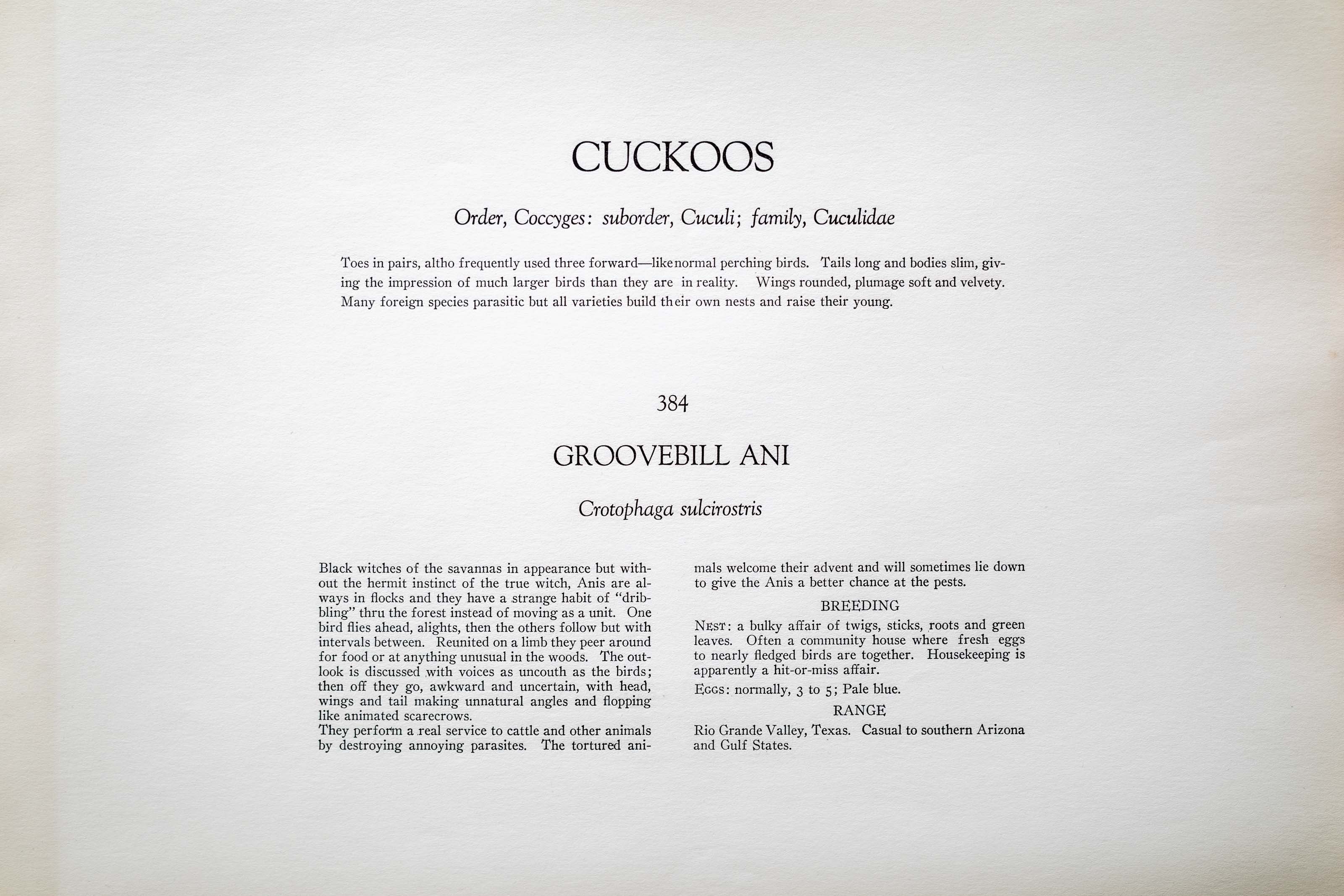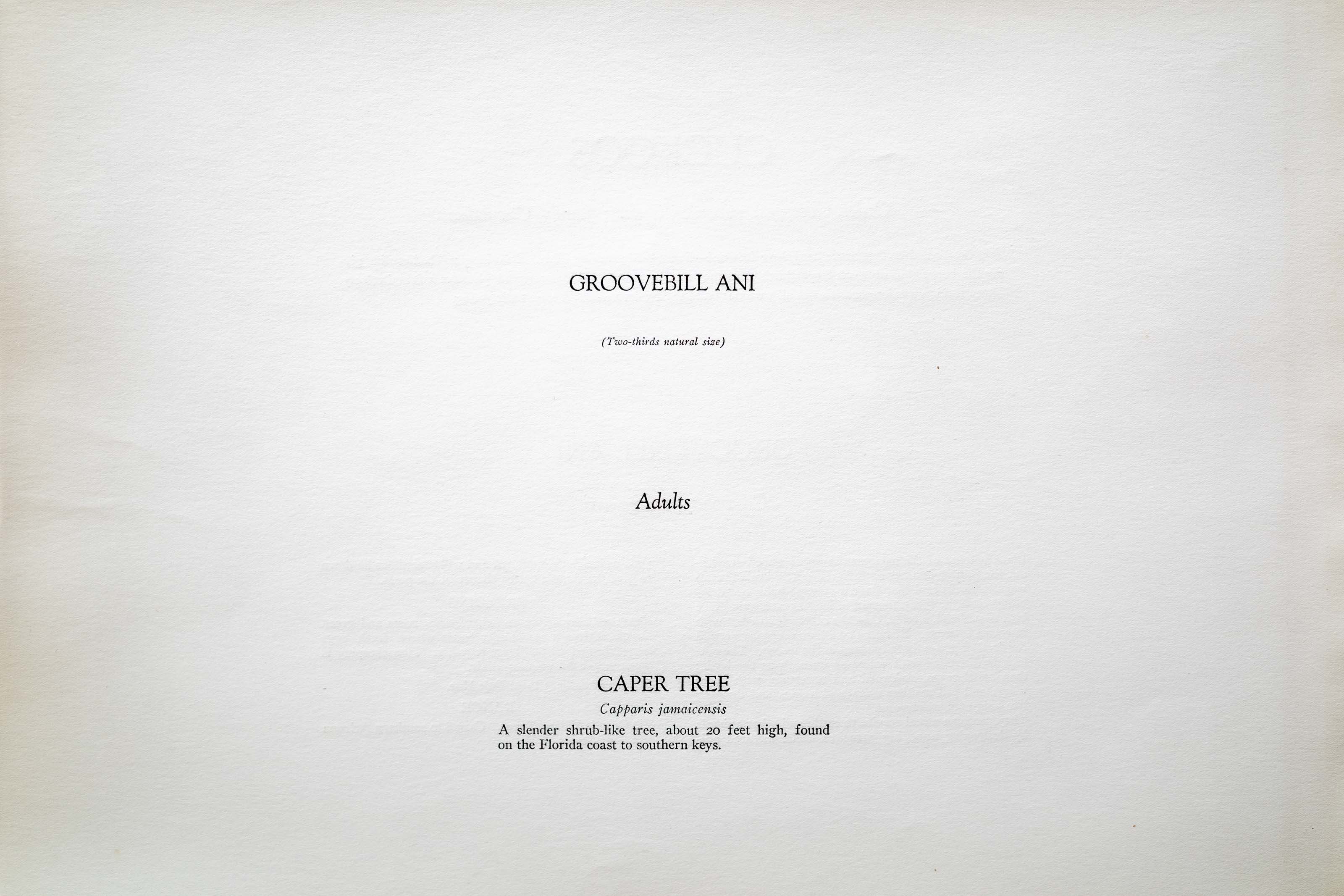 Black witches of the savannas in appearance but without the hermit instinct of the true witch, Anis are always in flocks and they have a strange habit of "dribbling" thru the forest instead of moving as a unit. One bird flies ahead, alights, then the others follow but with intervals between. Reunited on a limb they peer around for food or at anything unusual in the woods. The outlook is discussed with voices as uncouth as the birds; then off they go, awkward and uncertain, with head, wings and tail making unnatural angles and flopping like animated scarecrows.