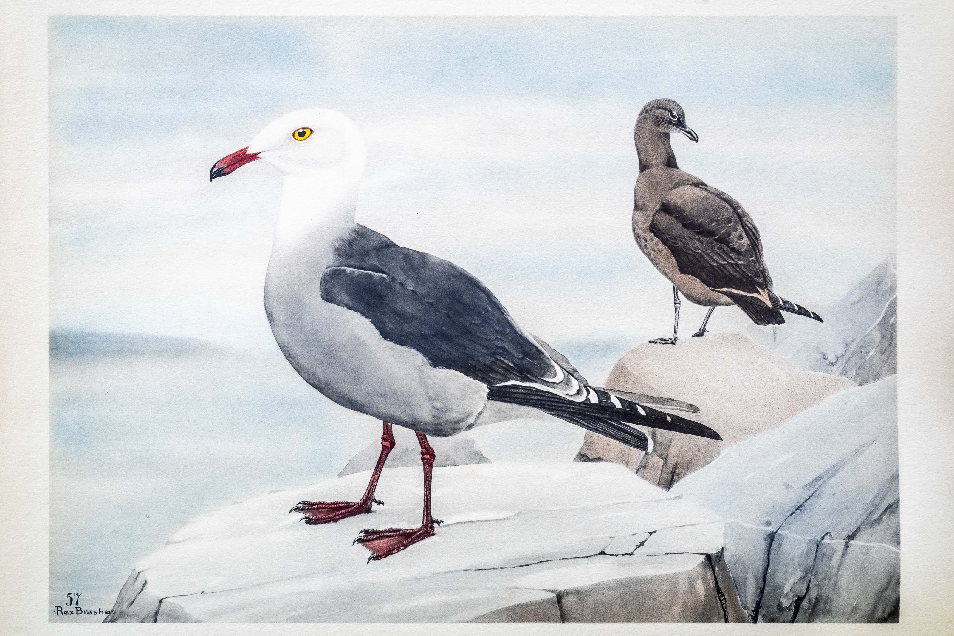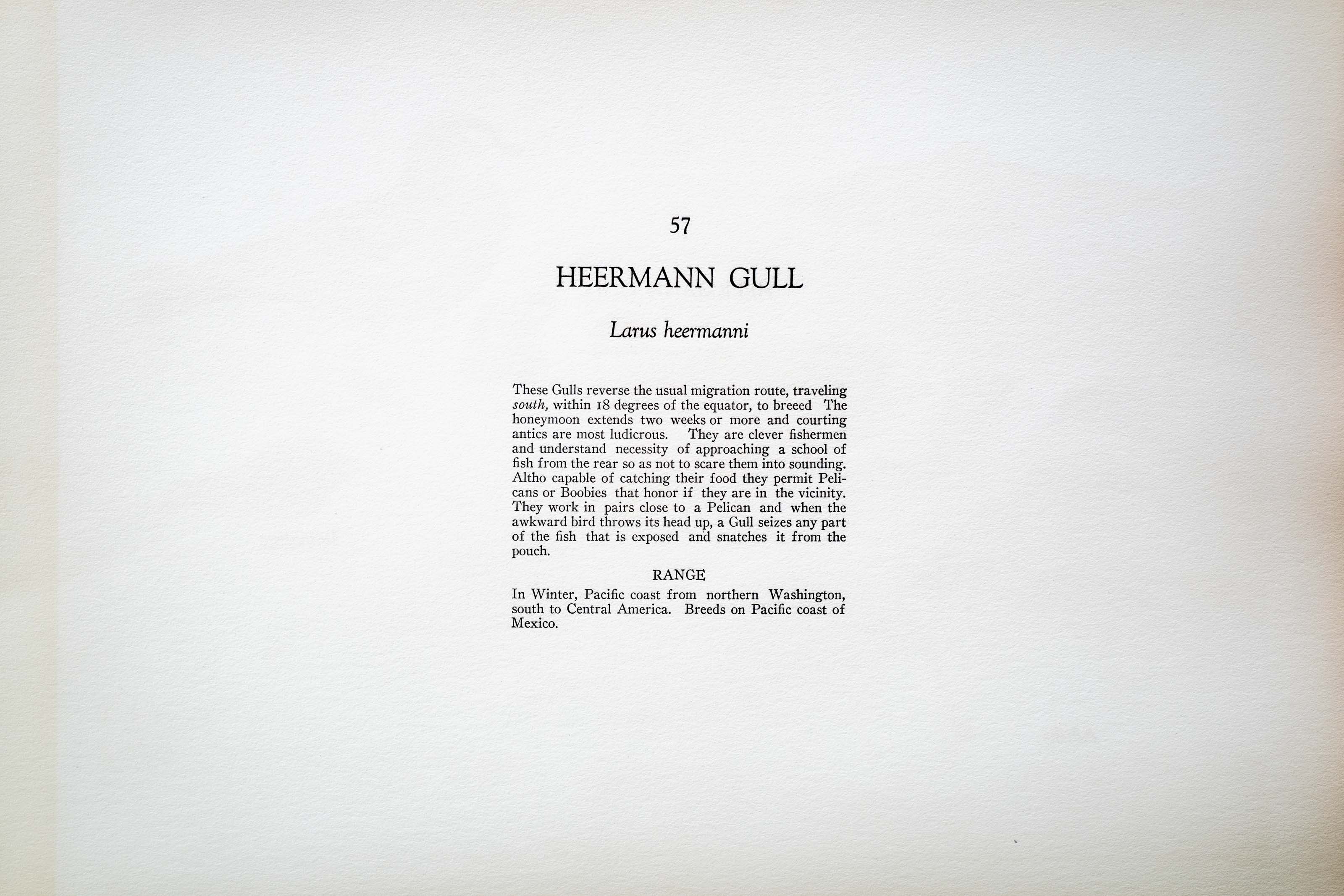 These Gulls reverse the usual migration route, traveling south, within 18 degrees of the equator, to breed. The honeymoon extends two weeks or more and courting antics are most ludicrous. They are clever fishermen and understand necessity of approaching a school of fish from the rear so as not to scare them into sounding. Altho capable of catching their food they permit Pelicans or Boobies that honor if they are in the vicinity. They work in pairs close to a Pelican and when the awkward bird throws its head up, a Gull seizes any part of the fish that is exposed and snatches it from the pouch.