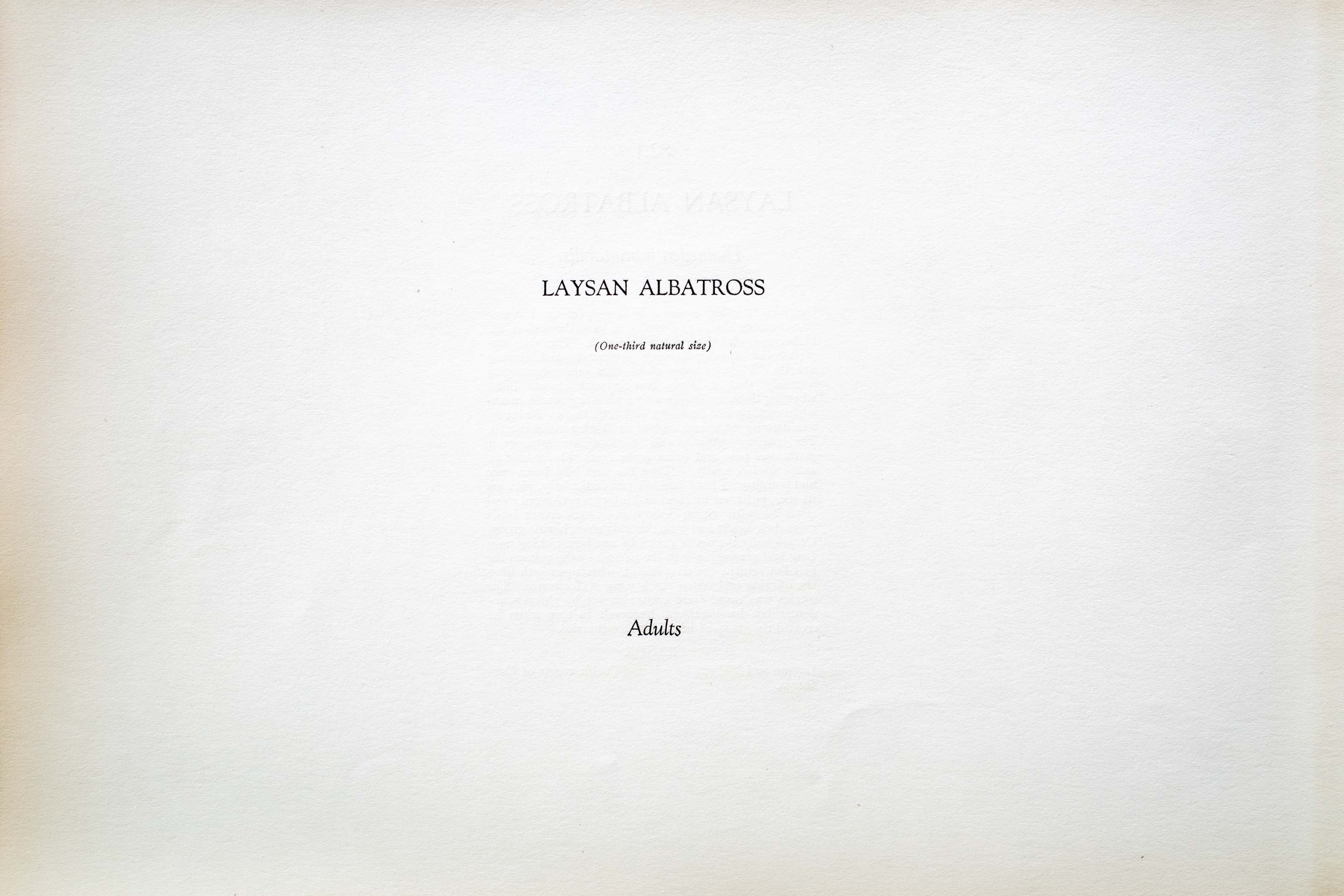 Deprived of wing exercise by family cares, LAYSAN ALBATROSSES revert to dancing to keep themselves fit. Fisher calls this diversion a cakewalk. The birds approach one another bowing profoundly and stepping heavily. They swagger about each other, curtseying solemnly, then suddenly fencing with crossed bills; whetting them sometimes with a whistling sound, meanwhile pecking and dropping stiff little bows. Suddenly one lifts its wing and nibbles at feathers underneath. The partner during this performance assumes a statuesque pose and either looks from side to side or snaps its bill loudly. Then the first bird bows once and pointing its head and bill perpendicularly, rises on its toes, puffs out its chest and utters a prolonged nasal Ah-h-h-h with rising inflection. Often other birds raise their heads and echo this ridiculous bovine groan. Occasionally the act is varied by one bird picking up a twig and presenting it to the partner — who refuses the gift but returns the compliment, whereupon both drop the offering and renew the bowing performance. The species was saved from extinction not by plume murderers but by President Roosevelt in 1909 when he created the group of island bird sanctuaries.