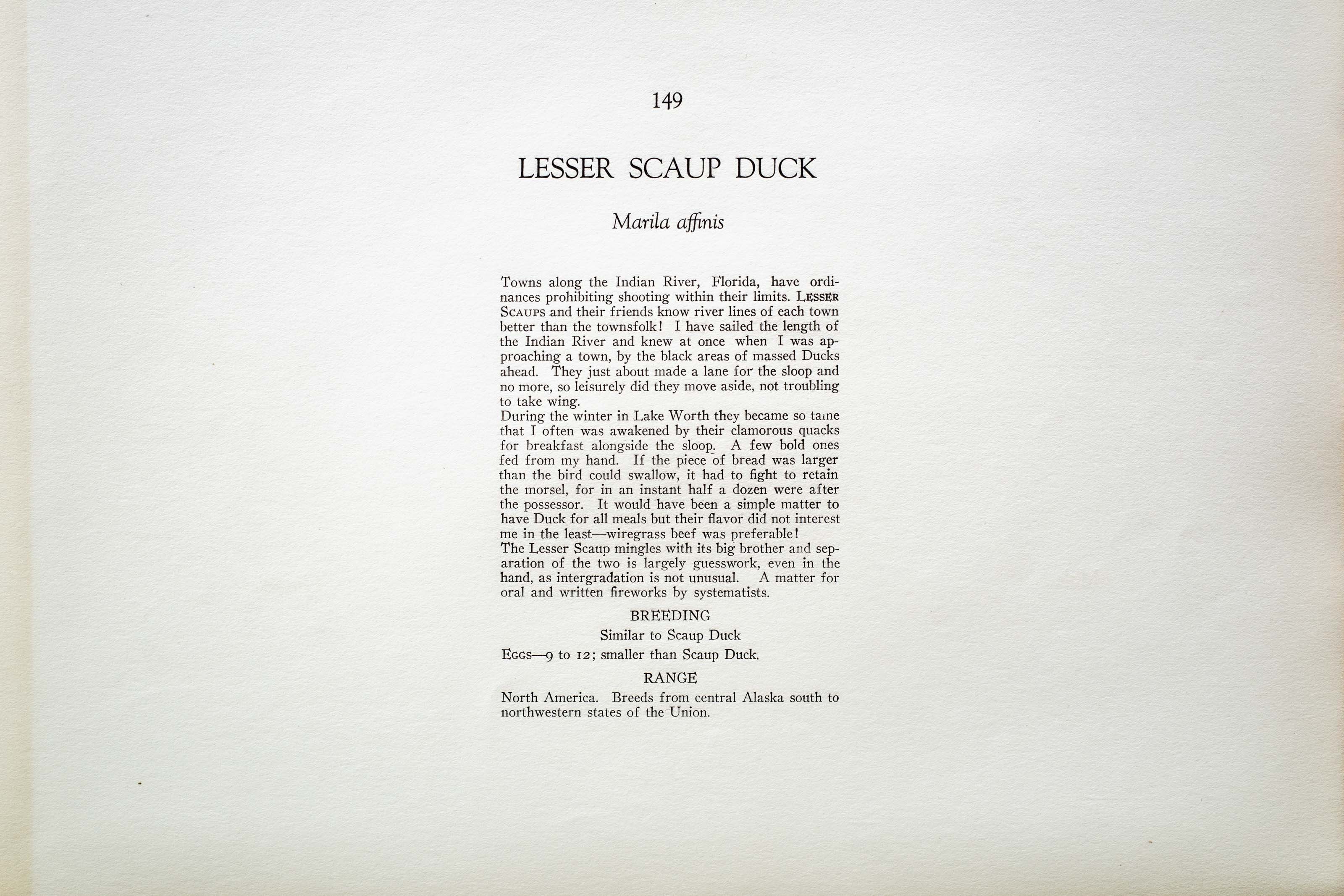 Towns along the Indian River, Florida, have ordinances prohibiting shooting within their limits. LESSER SCAUPS and their friends know river lines of each town better than the townsfolk! I have sailed the length of the Indian River and knew at once when I was approaching a town, by the black areas of massed Ducks ahead. They just about made a lane for the sloop and no more, so leisurely did they move aside, not troubling to take wing.