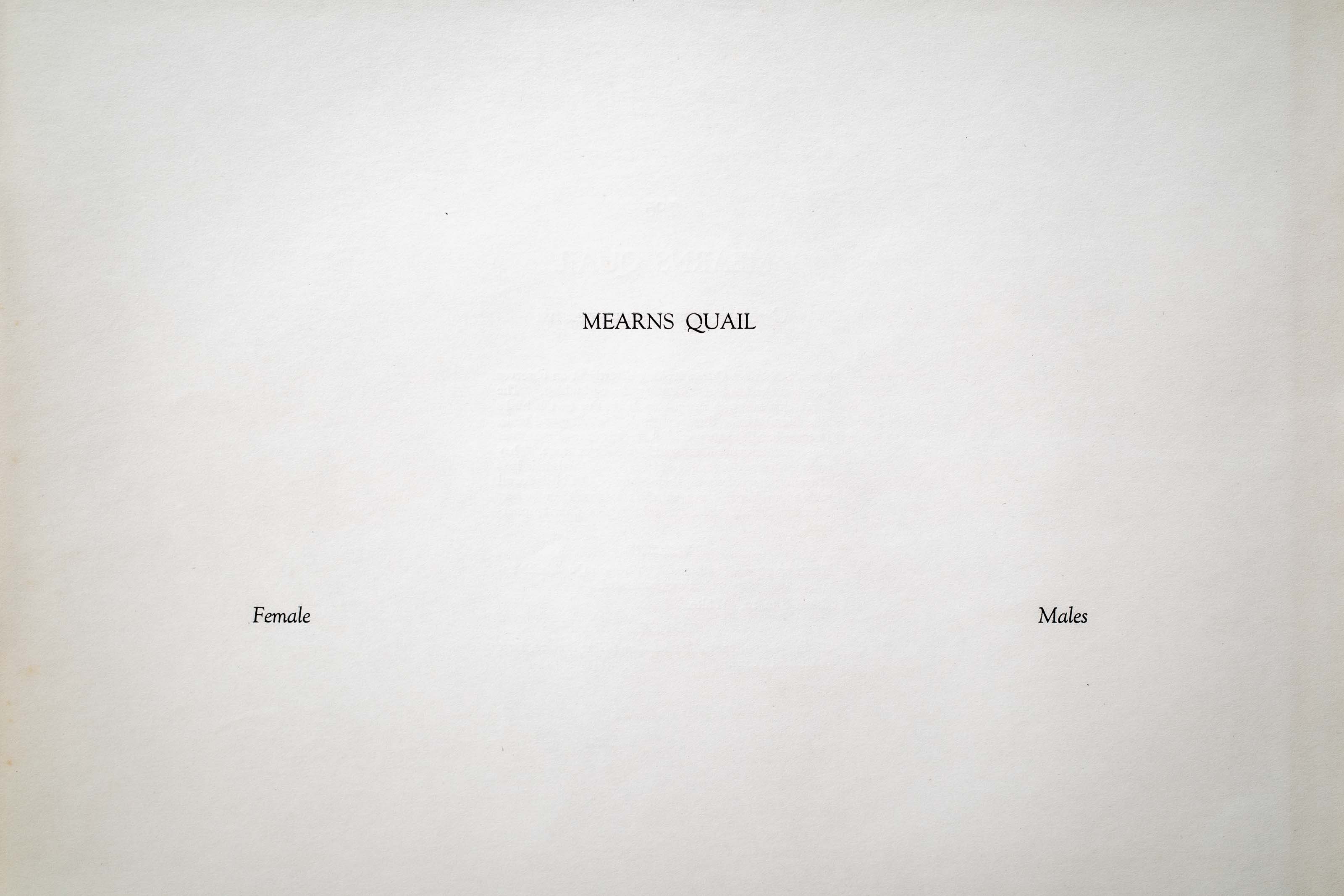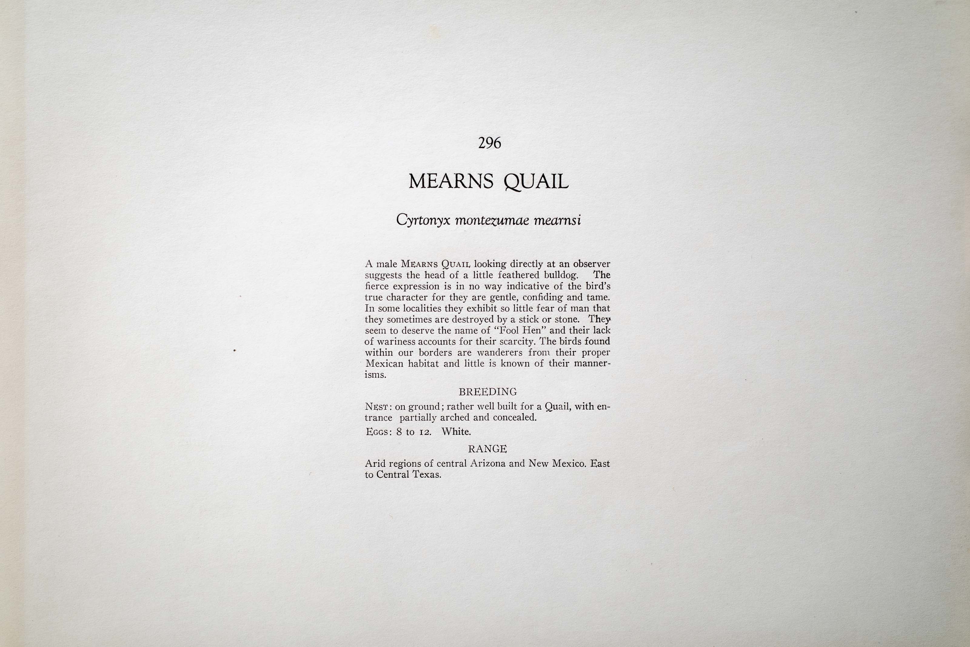 A male MEARNS QUAIL, looking directly at an observer suggests the head of a little feathered bulldog. The fierce expression is in no way indicative of the bird's true character for they are gentle, confiding and tame. In some localities they exhibit so little fear of man that they sometimes are destroyed by a stick or stone. They seem to deserve the name of "Fool Hen" and their lack of wariness accounts for their scarcity. The birds found within our borders are wanderers from their proper Mexican habitat and little is known of their mannerisms.