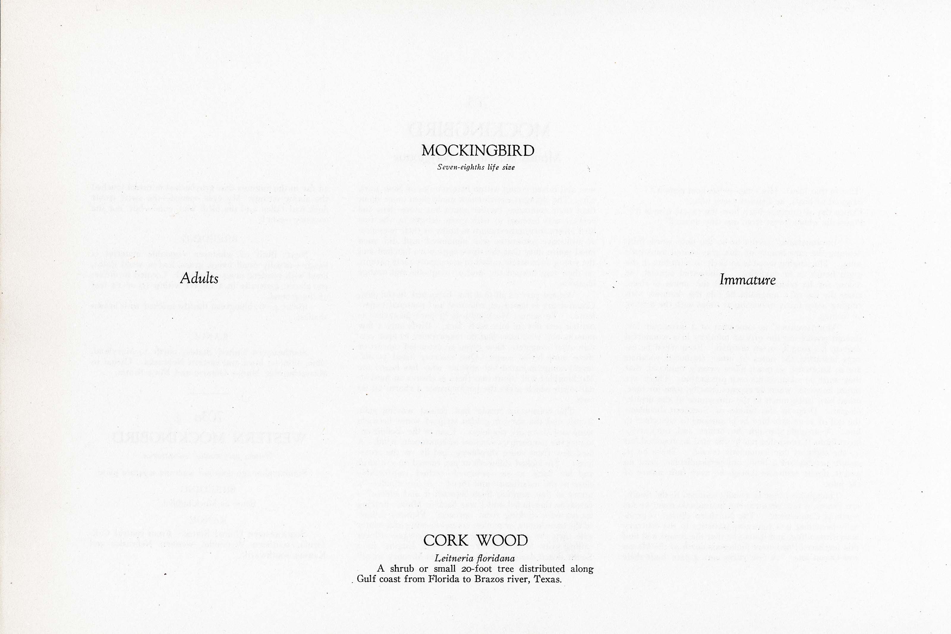 "MOCKINGBIRD" is somewhat of a misnomer for, though possessing the gift of mimicry in a wonderful degree, his song is often original. Even when he essays imitation the notes of other feathered vocalists are so improved, so much more sweetly rendered, that they must be taken as his own production. There are times, however, when he repeats exactly, tone for tone, other bird calls, much to the annoyance of the ornithologist. Deep in the tangle of Southern shrubbery the call of some rare bird he is anxious to see comes to him. A struggle through the briars and intricately-laced limbs is rewarded not by the bird he expected but by the sight of our loquacious friend. There he is, calmly perched on a limb, tail perpendicular, head up and it almost seems as though he were fully aware of the joke.