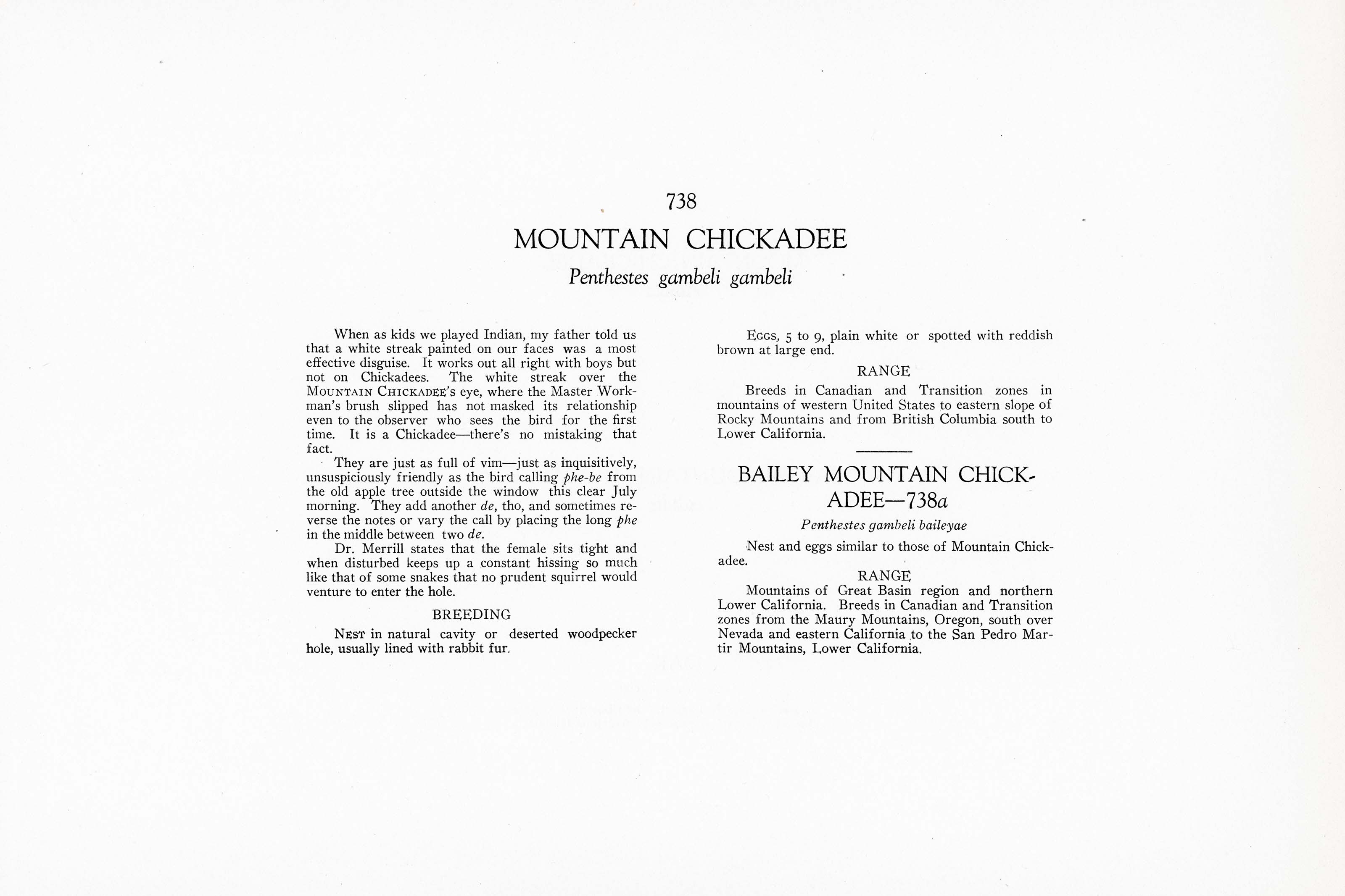 When as kids we played Indian, my father told us that a white streak painted on our faces was a most effective disguise. It works out all right with boys but not on Chickadees. The white streak over the MOUNTAIN CHICKADEE'S eye, where the Master Workman's brush slipped has not masked its relationship even to the observer who sees the bird for the first time. It is a Chickadee — there's no mistaking that fact.
