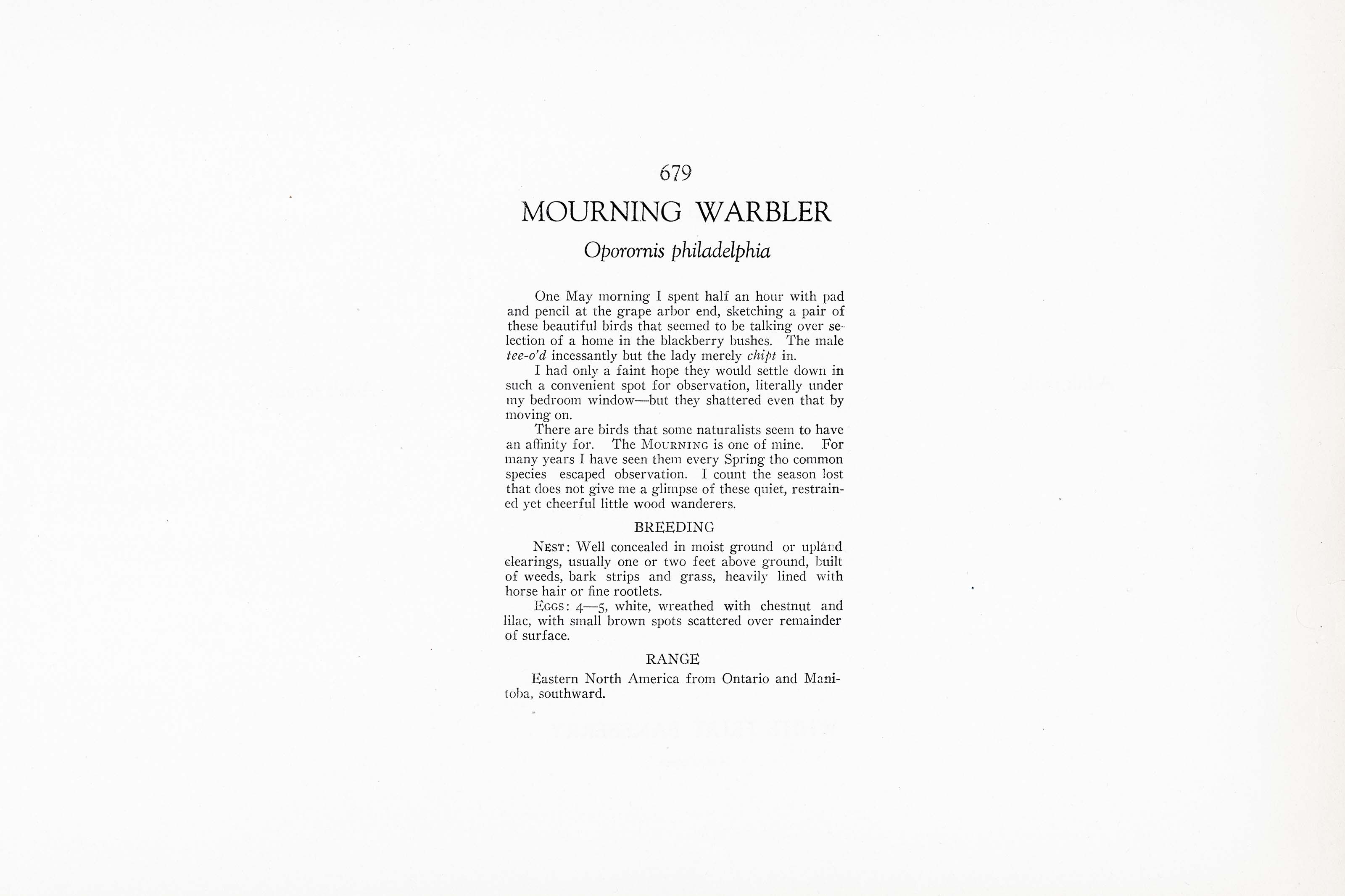 There are birds that some naturalists seem to have an affinity for. The MOURNING is one of mine. For many years I have seen them every Spring tho common species escaped observation. I count the season lost that does not give me a glimpse of these quiet, restrained yet cheerful little wood wanderers.