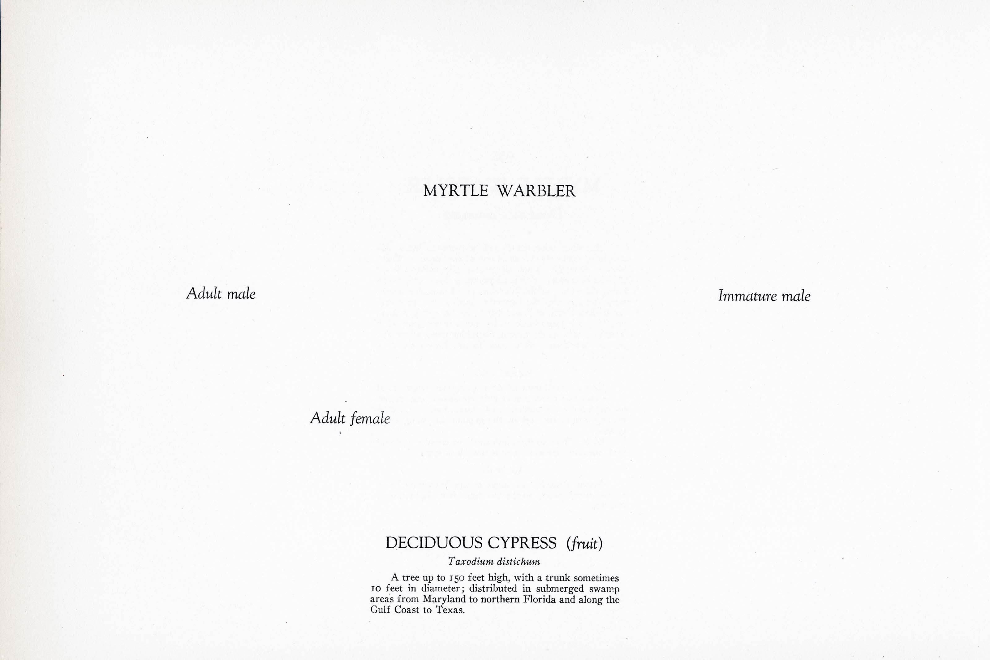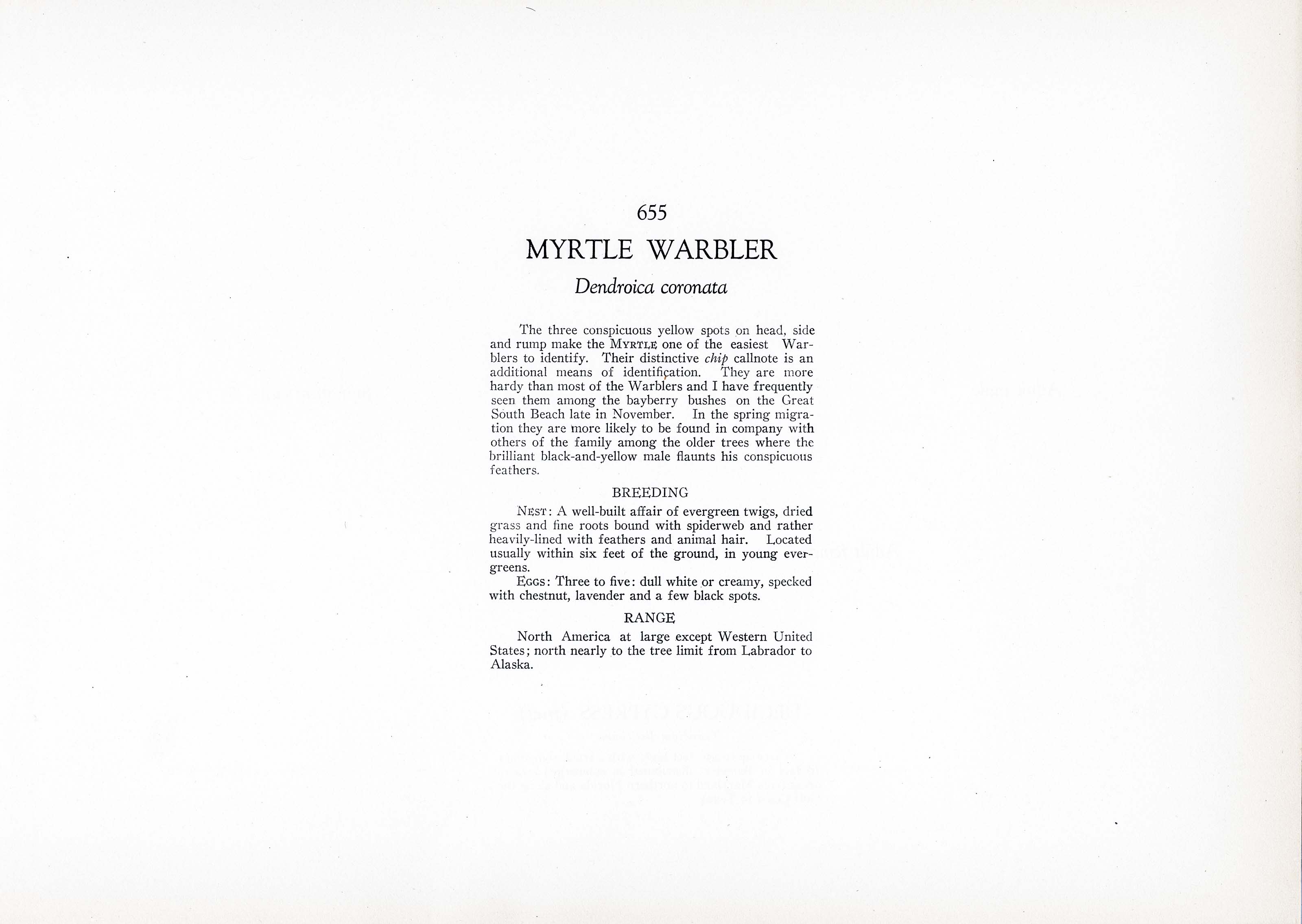 The three conspicuous yellow spots on head, side and rump make the MYRTLE one of the easiest Warblers to identify. Their distinctive chip callnote is an additional means of identification. They are more hardy than most of the Warblers and I have frequently seen them among the bayberry bushes on the Great South Beach late in November. In the spring migration they are more likely to be found in company with others of the family among the older trees where the brilliant black-and-yellow male flaunts his conspicuous feathers.
