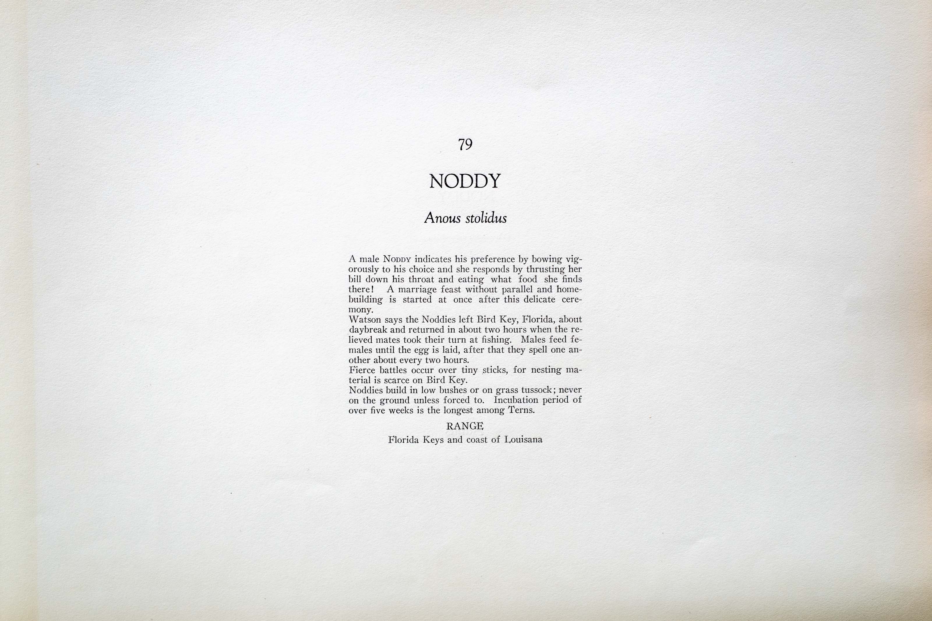 Watson says the Noddies left Bird Key, Florida, about daybreak and returned in about two hours when the relieved mates took their turn at fishing. Males feed females until the egg is laid, after that they spell one another about every two hours.