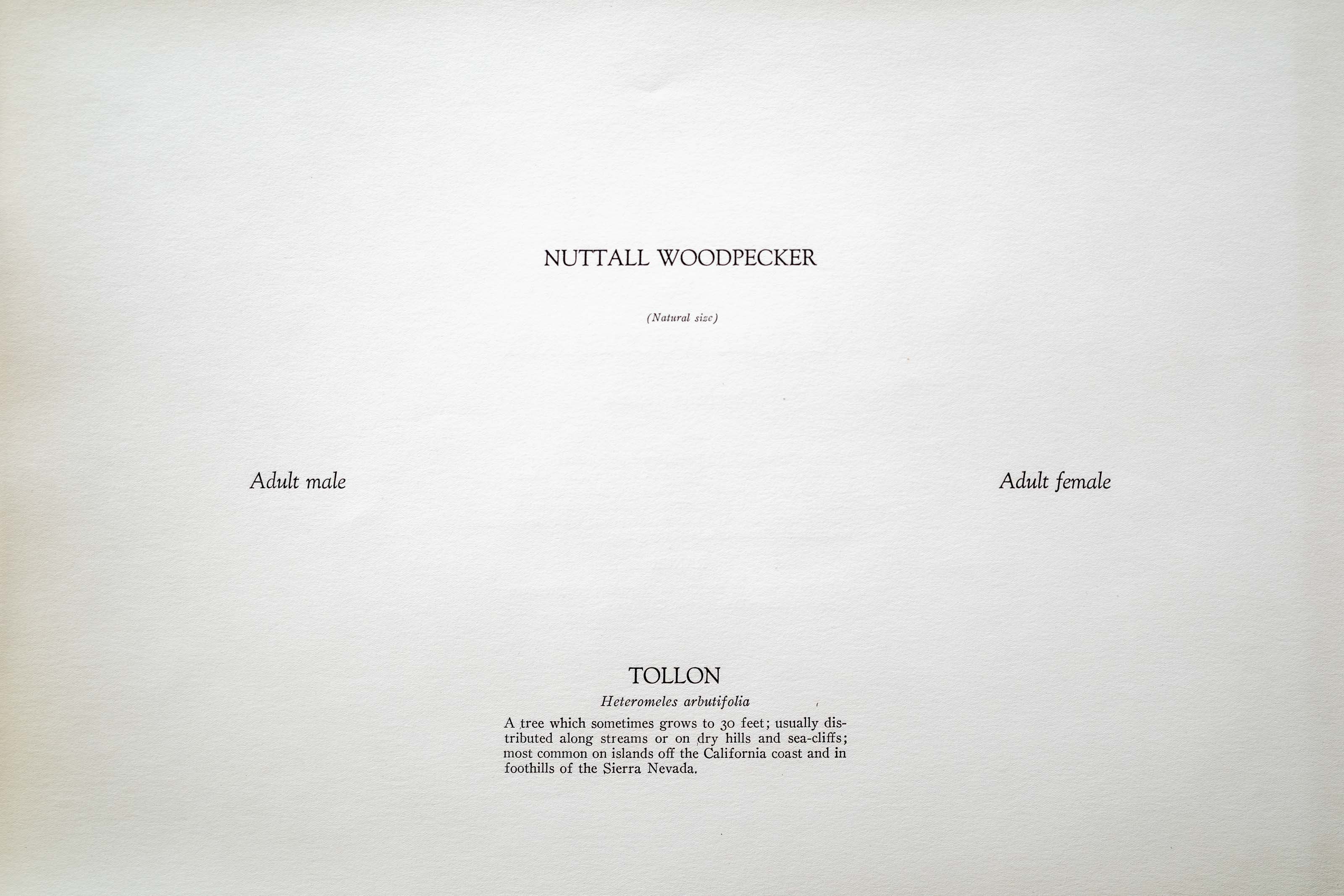 When a Downy alights beneath a limb it starts tapping but NUTTALL WOODPECKER is said to turn often "like an inverted weather cock." They are quite pugnacious and attack birds up to the size of a Flicker and generally get the decision! With these exceptions their habits are quite similar to others of the genus.
