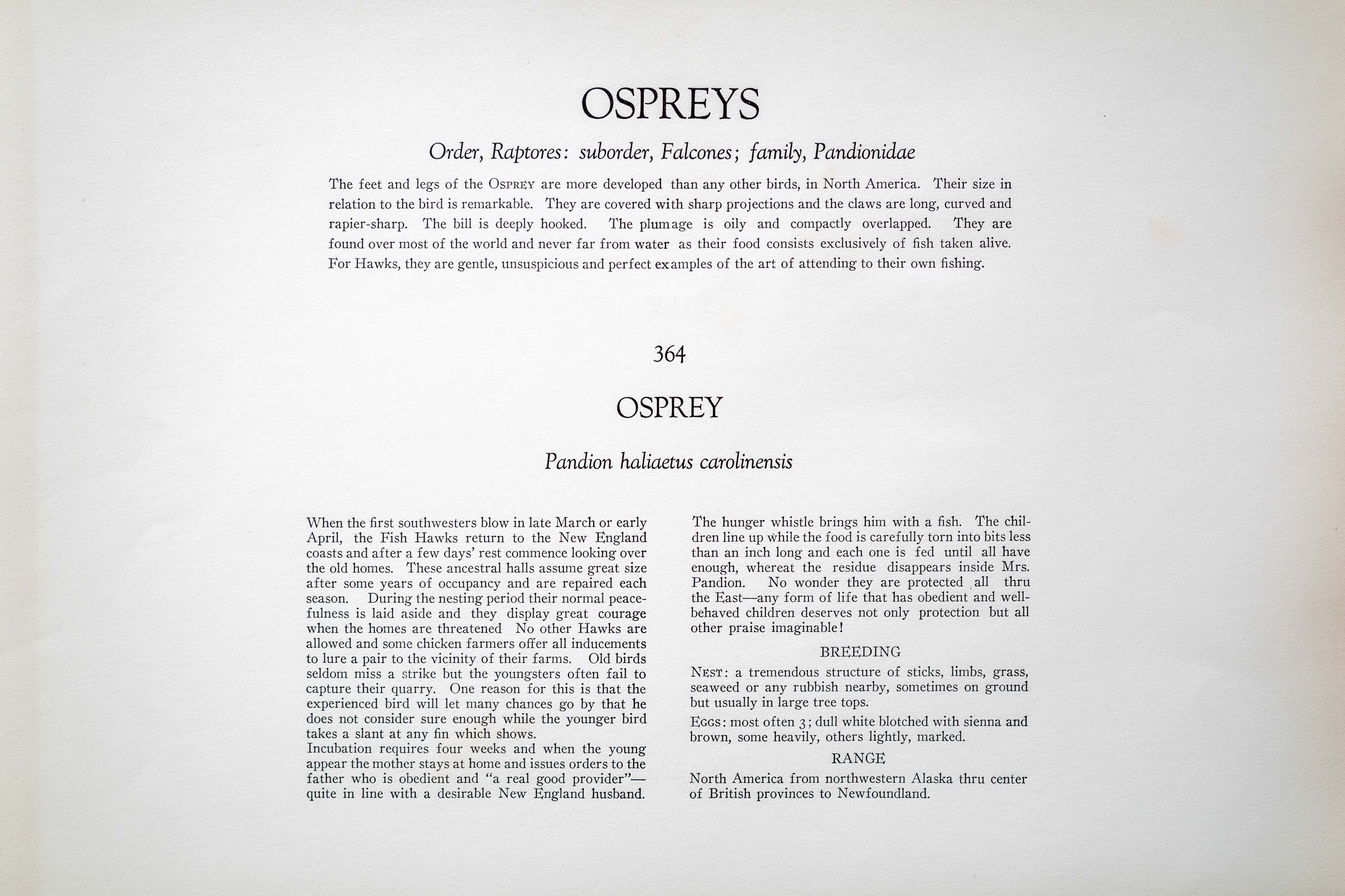 When the first southwesters blow in late March or early April, the Fish Hawks return to the New England coasts and after a few days' rest commence looking over the old homes. These ancestral halls assume great size after some years of occupancy and are repaired each season. During the nesting period their normal peacefulness is laid aside and they display great courage when the homes are threatened. No other Hawks are allowed and some chicken farmers offer all inducements to lure a pair to the vicinity of their farms. Old birds seldom miss a strike but the youngsters often fail to capture their quarry. One reason for this is that the experienced bird will let many chances go by that he does not consider sure enough while the younger bird takes a slant at any fin which shows.