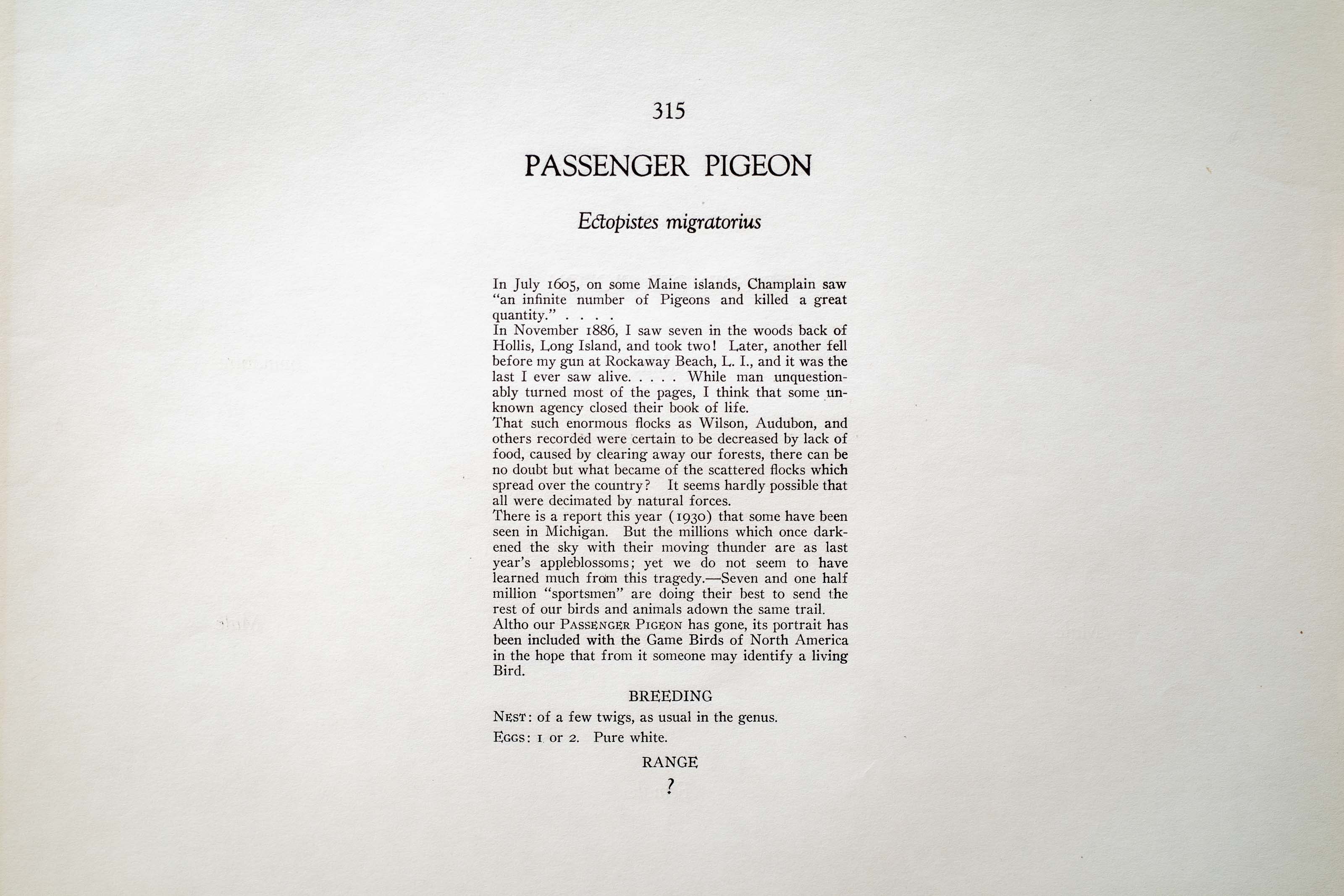 There is a report this year (1930) that some have been seen in Michigan. But the millions which once darkened the sky with their moving thunder are as last year's appleblossoms; yet we do not seem to have learned much from this tragedy. — Seven and one half million "sportsmen" are doing their best to send the rest of our birds and animals adown the same trail.