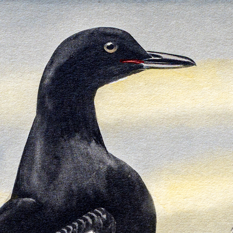 Mount Desert loomed, a gray shadow against the western night gloom, fading fast before the dawn. Off the starboard bow I caught a glint of light and as the sloop drew onward I saw it came from a GUILLEMOT'S wing-patch reflecting the early sunlight. Soon another appeared and was instantly pursued by the ardent mate. She dove and her swain rose and flew a short distance, alighting about where he thot she would come to the surface. The game of tag went on for twenty minutes and it was interesting to see how accurately he followed her hidden course under water. Invariably she came up within a few feet of him and I suspect her eyes were on his shadow while she swam beneath. Coy little tricks are not unknown among females!